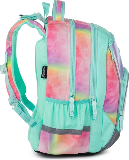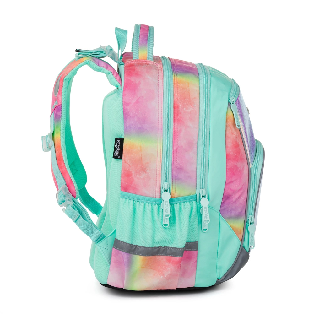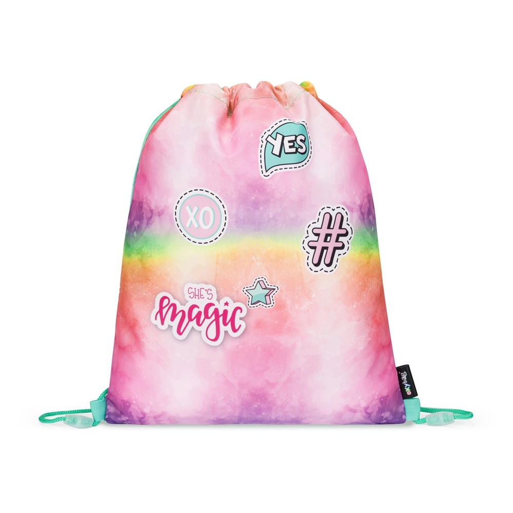 Školský set OXY GO Magic kombinuje atraktívny dúhový dizajn s vysokou praktickosťou pre každý školský deň. Hlavným prvkom je ľahký batoh s ergonomicky tvarovaným a priedušným chrbtom, nastaviteľnými ramennými popruhmi a šikovnými háčikmi na upevnenie dlhších popruhov. Veľký hlavný priestor a vnútorné vrecká udržia učebnice, zošity aj desiatu prehľadne na mieste, zatiaľ čo pevné nepremokavé dno chráni obsah pred vlhkosťou a zašpinením.