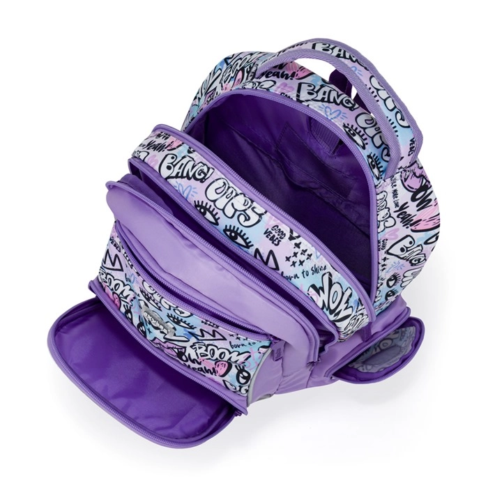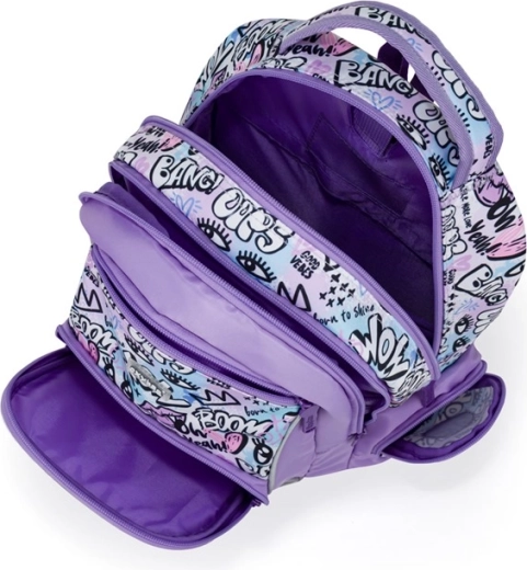 Dve vnútorné komory, množstvo malých vreciek a bočné vrecká (jedno otvorené na fľašu, druhé na zips) udržia školské potreby prehľadne usporiadané.