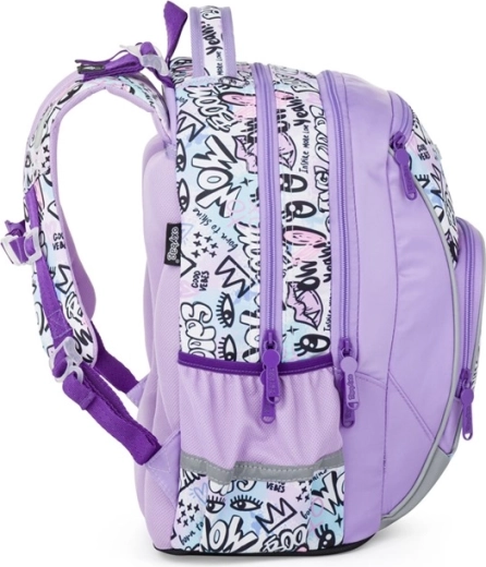 Vnútorné členenie tvoria dve priestranné komory na učebnice a zošity, doplnené o praktické menšie vrecká na drobnosti. Po stranách nájdete dve vrecká – jedno otvorené na fľašu a druhé na zips pre bezpečné uloženie. Nechýbajú reflexné prvky na lepšiu viditeľnosť za šera a háčiky na uchytenie dlhých popruhov pre čistý a bezpečný vzhľad.