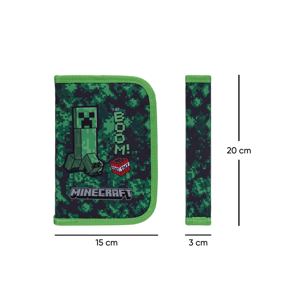 Štýlový školský peračník s motívom MINECRAFT Boom ponúka praktické jednoposchodové prevedenie s dvomi chlopňami, odolný zips YKK a prehľadné usporiadanie. Vo vnútri nájdete vrecko na drobnosti, okienko na rozvrh hodín a pevné gumičky kompatibilné aj s trojhrannými ceruzkami a fixkami. Peračník je bez náplne a vyrobený z recyklovaného materiálu.