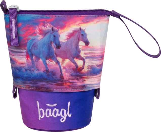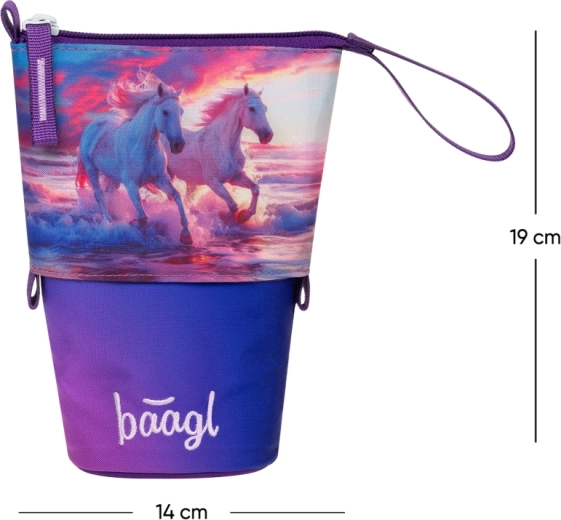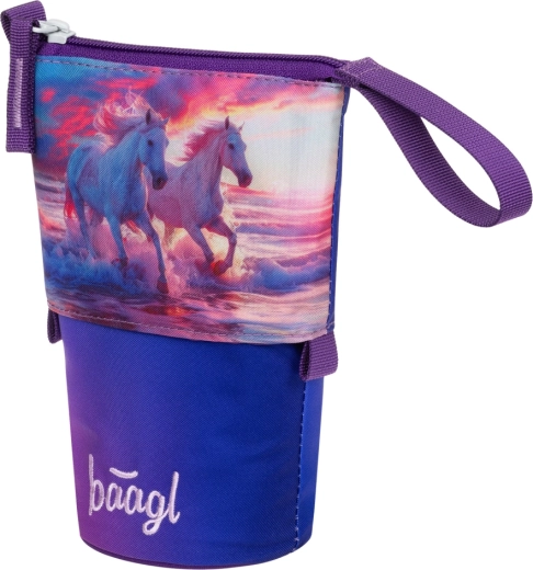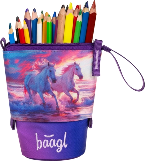 Štýlový a odolný peračník Pastelkovník od Baagl s motívom Kone Srdce ponúka premyslené usporiadanie písacích potrieb a funkciu stojana na stôl jediným ťahom. Vyrobený z pevného vodoodolného materiálu, spoľahlivo chráni obsah, má tajné vnútorné vrecko na drobnosti a vďaka certifikácii GRS obsahuje minimálne 50 % recyklovaných materiálov.