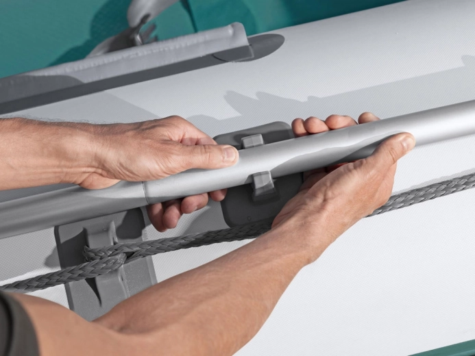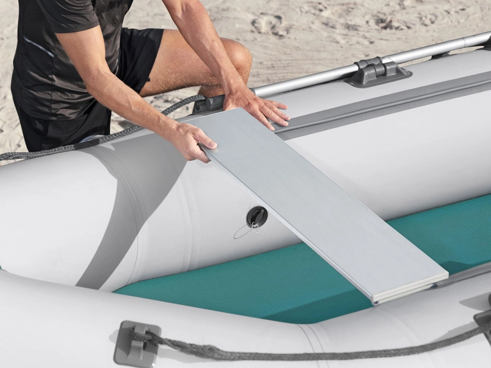 Nafukovacia podlaha z materiálu drop‑stitch poskytuje mimoriadnu tuhosť, istý krok a lepšie rozloženie hmotnosti celej posádky.
