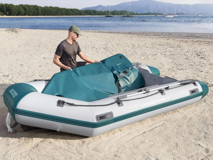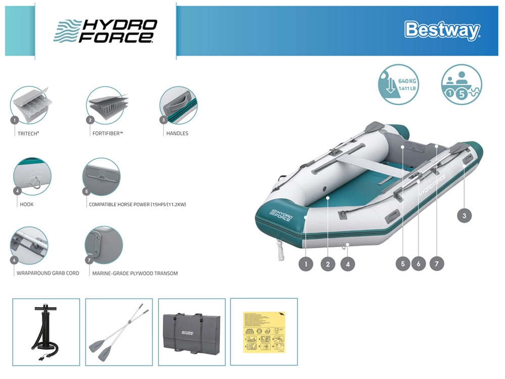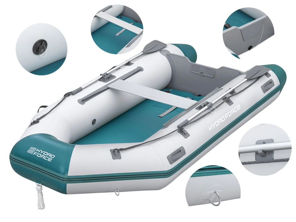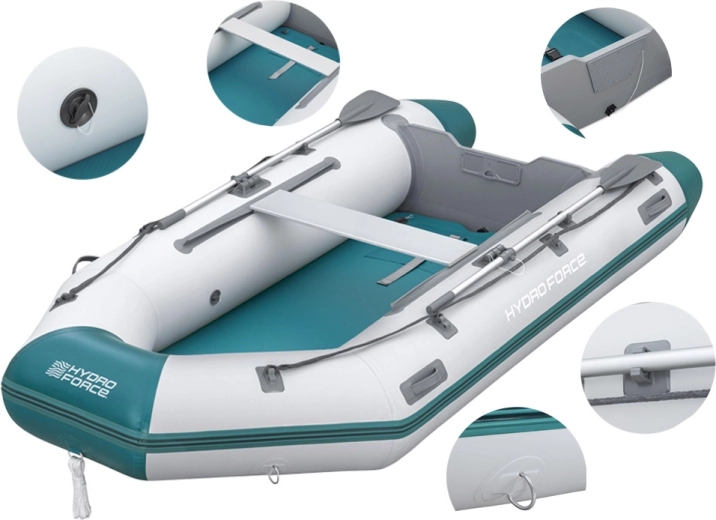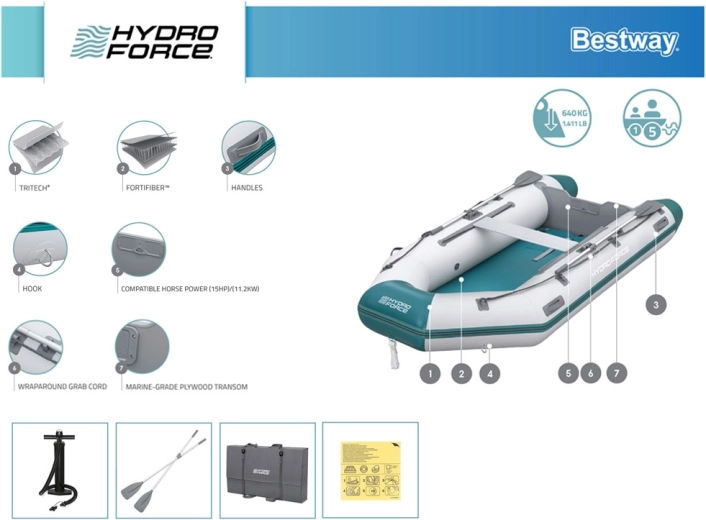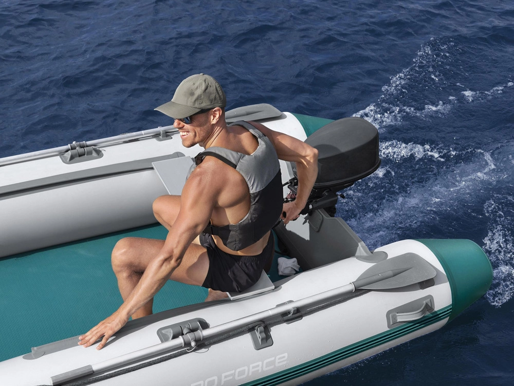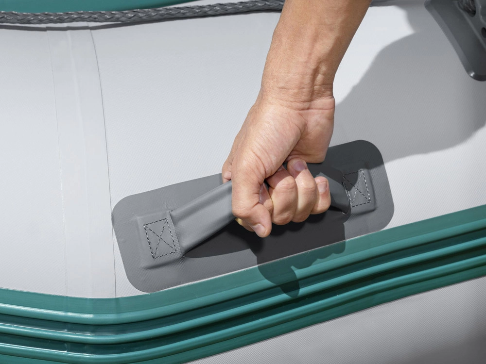 Praktická výbava zahŕňa úchyty na pádla, oarlocky, obvodové záchytné lano, rýchloventilky pre bleskové sprevádzkovanie aj vypustenie a modulárnu podlahu a sedák pre pohodlné usadenie posádky. Odporúčaný závesný motor je až 11,2 kW / 15 HP (nie je súčasťou balenia).