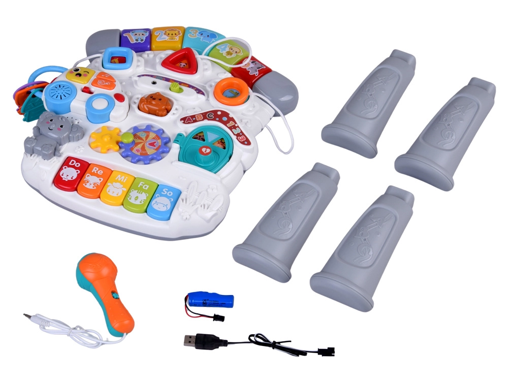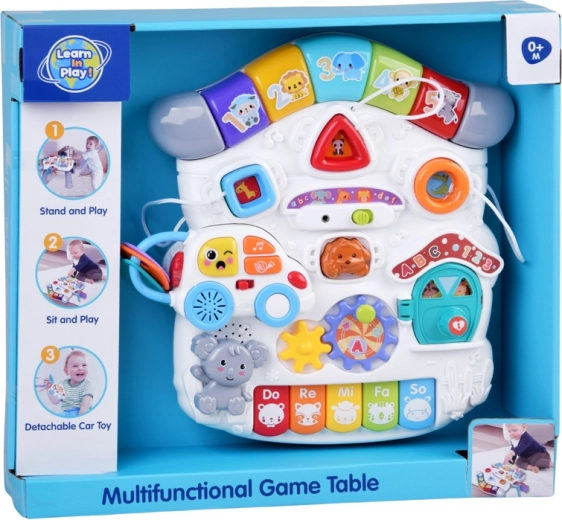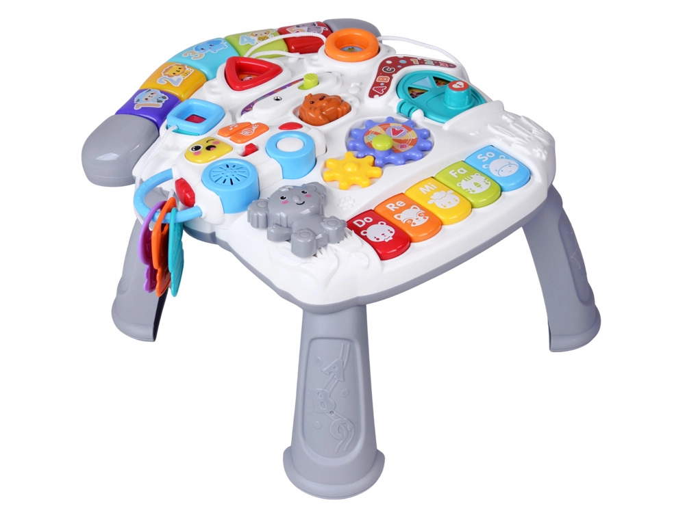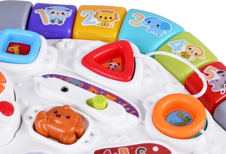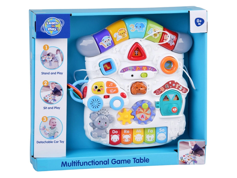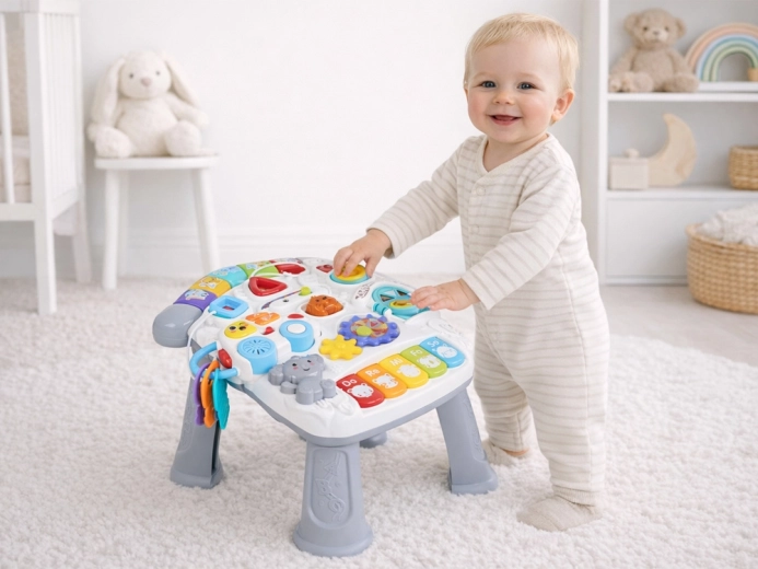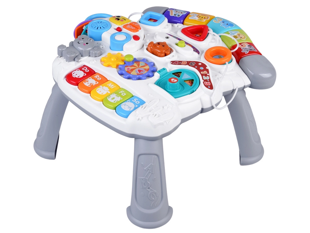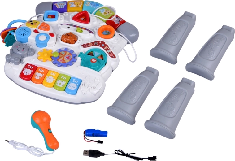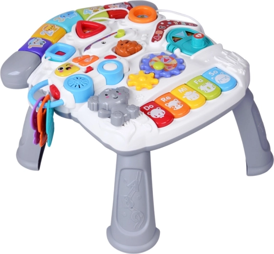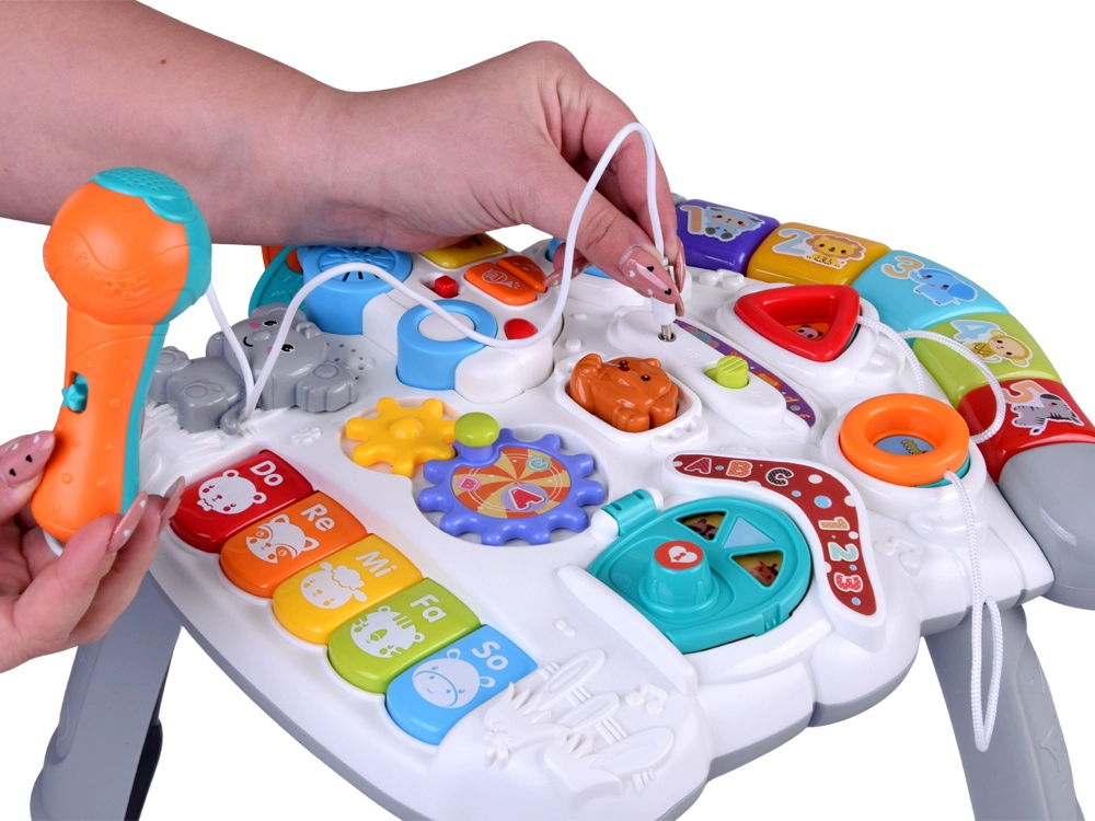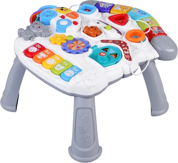 Farebný interaktívny stolík pre najmenších je malé centrum objavovania a hudby. Ponúka svetelné efekty, melódie, mini klavír Do-Re-Mi, otáčacie ozubené kolieska, tlačidlá tvarov a zvieratiek, odnímateľné autíčko s kľúčmi aj mikrofón. Rozvíja jemnú motoriku, koordináciu ruka–oko, učenie farieb, tvarov a zvukov a podporuje samostatnú hru.