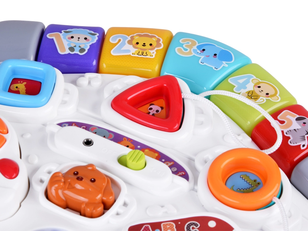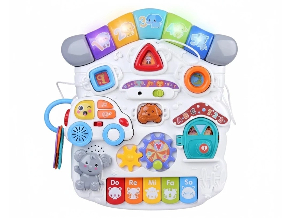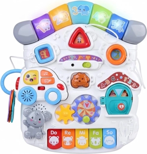 Hudobný panel s klaviatúrou Do–Re–Mi, mikrofónom a zábavnými efektmi podporuje zmyslový rozvoj a rytmus. Panel tvarov pomáha spoznávať farby, tvary aj zvieratká, zatiaľ čo odnímateľné autíčko s kľúčmi zabaví aj mimo stolíka. Vďaka bohatej interakcii deti trénujú úchop, sústredenie a logické myslenie.