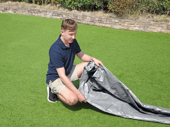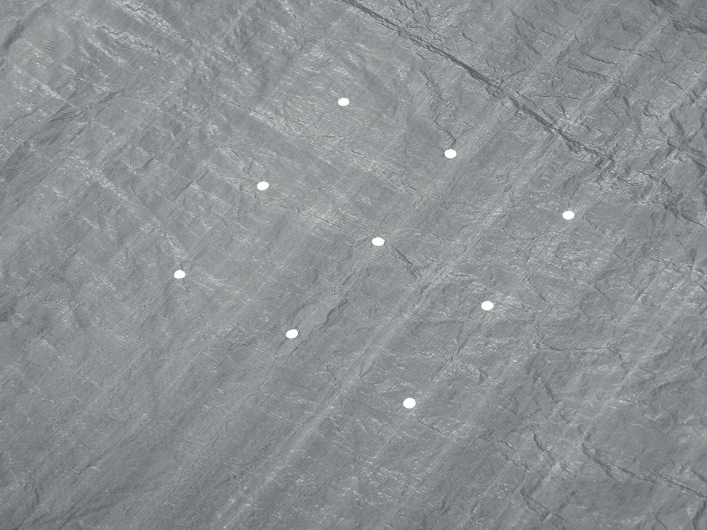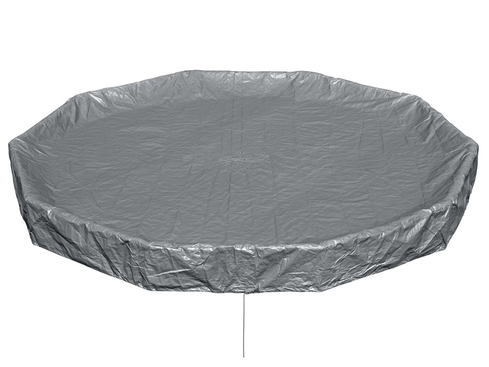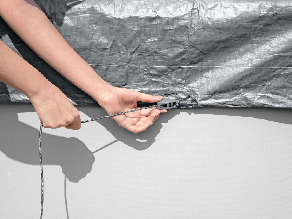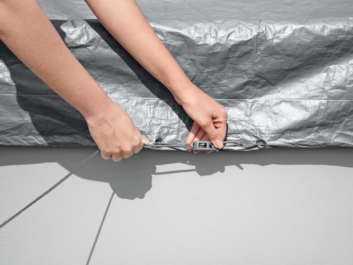 Šikovné drenážne otvory prepúšťajú dažďovú vodu, takže sa na kryte netvoria kaluže. Vetruodolný svorníkový mechanizmus a sťahovacia šnúrka zaistia pevné priľnutie po obvode, aby kryt držal na mieste aj pri horších poveternostných podmienkach.