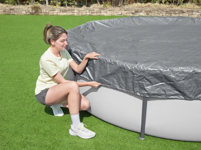 Prémiový kryt na okrúhly bazén s priemerom 3,05 m od značky BESTWAY spoľahlivo chráni vodu pred lístím, trávou a nečistotami. Je vyrobený zo zosilneného UV odolného materiálu s technológiou Polar‑Shield, ktorá zabezpečuje flexibilitu aj v mraze až do −25 °C. Praktické drenážne otvory bránia hromadeniu vody na povrchu a vetruodolné upínanie drží kryt pevne na mieste.