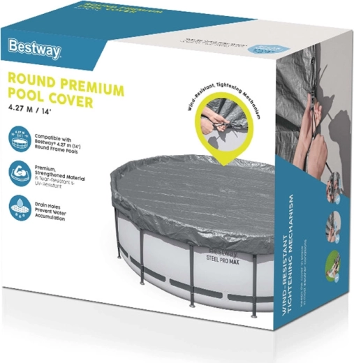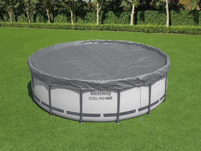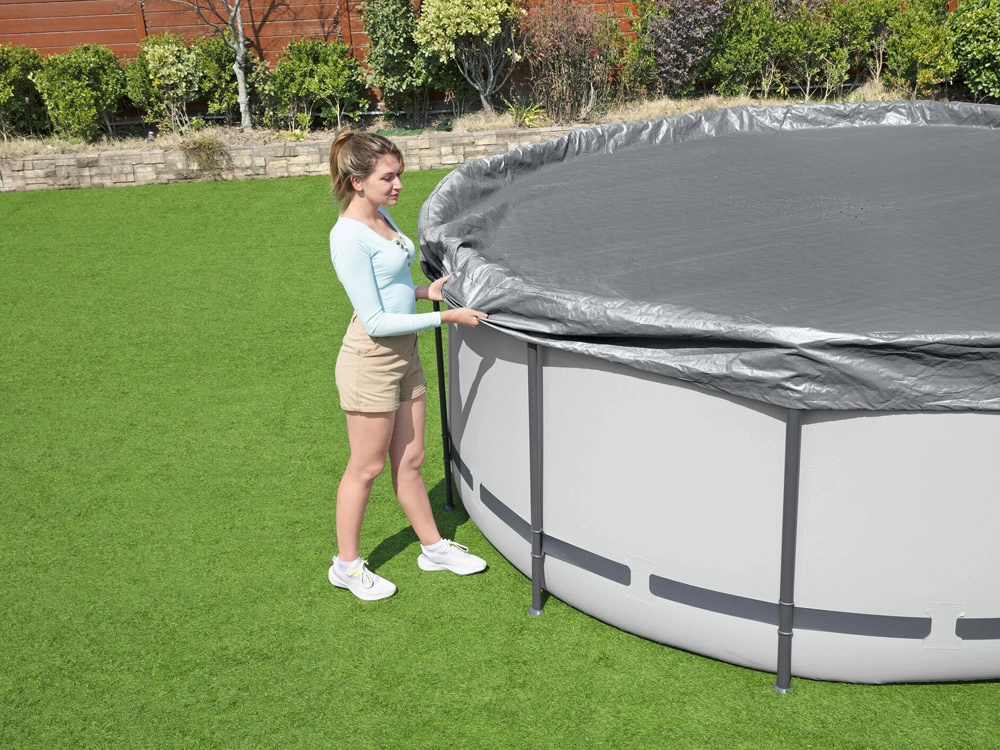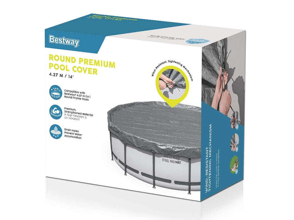 Kruhová krycia plachta BESTWAY Premium je navrhnutá pre nadzemné bazény s priemerom 4,27 m. Odolný materiál so zosilnením a UV ochranou predlžuje životnosť a pomáha udržať čistejšiu vodu s menšou potrebou údržby. Plachta sa ľahko nasadzuje a vďaka pevnému stiahnutiu odoláva bežným poveternostným podmienkam.