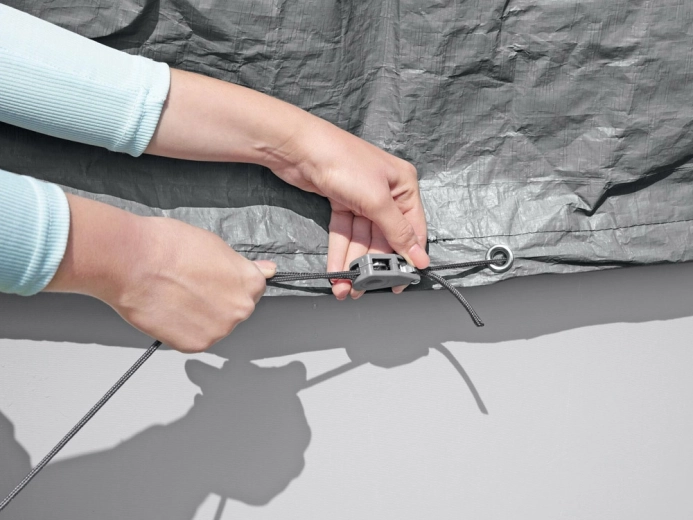 Obvodové lanká s aretačným zámkom pevne stiahnu plachtu okolo lemu bazéna, takže drží aj pri silnejších nárazoch vetra.