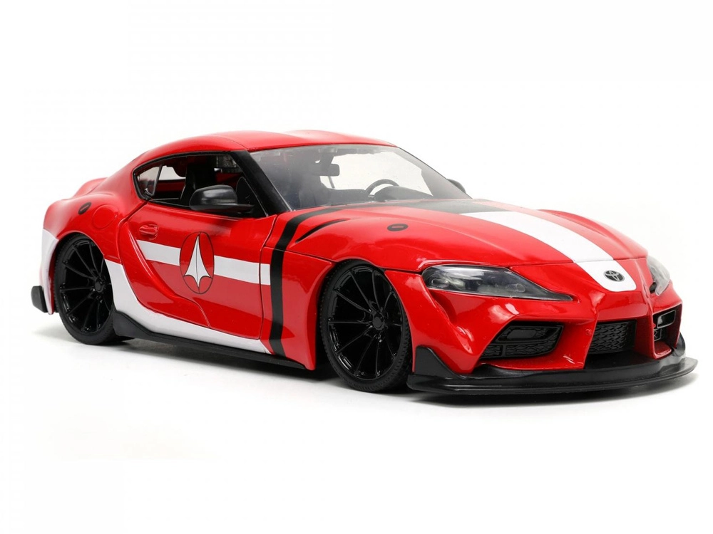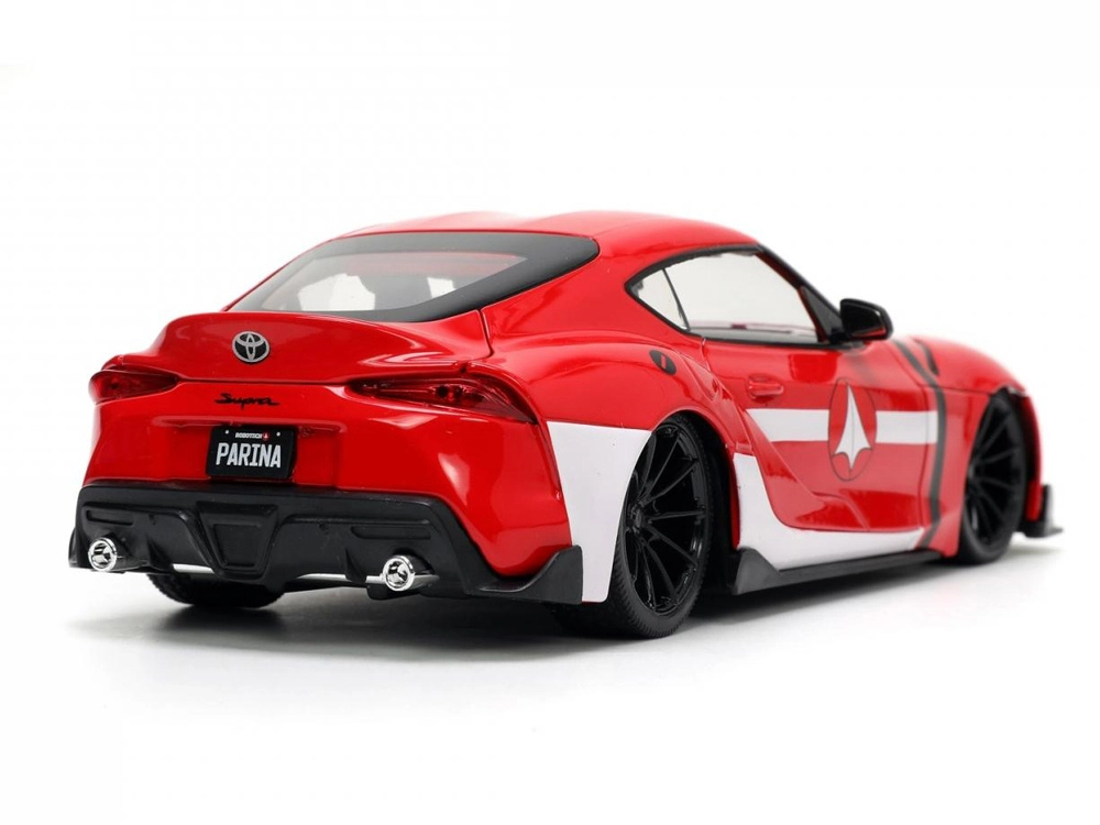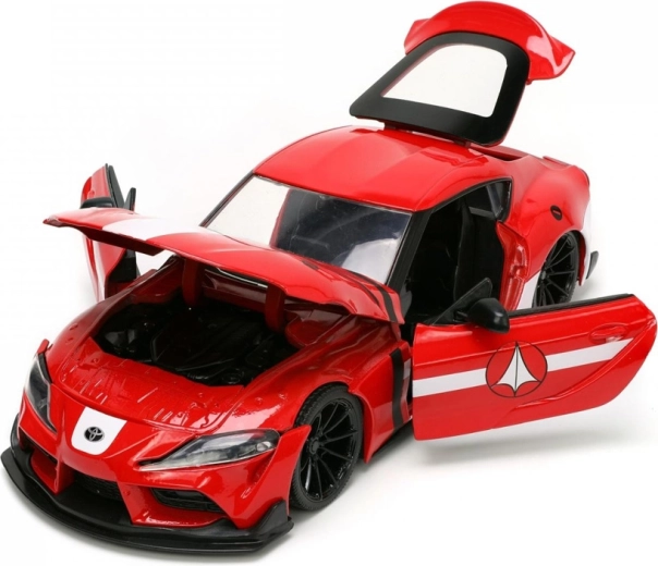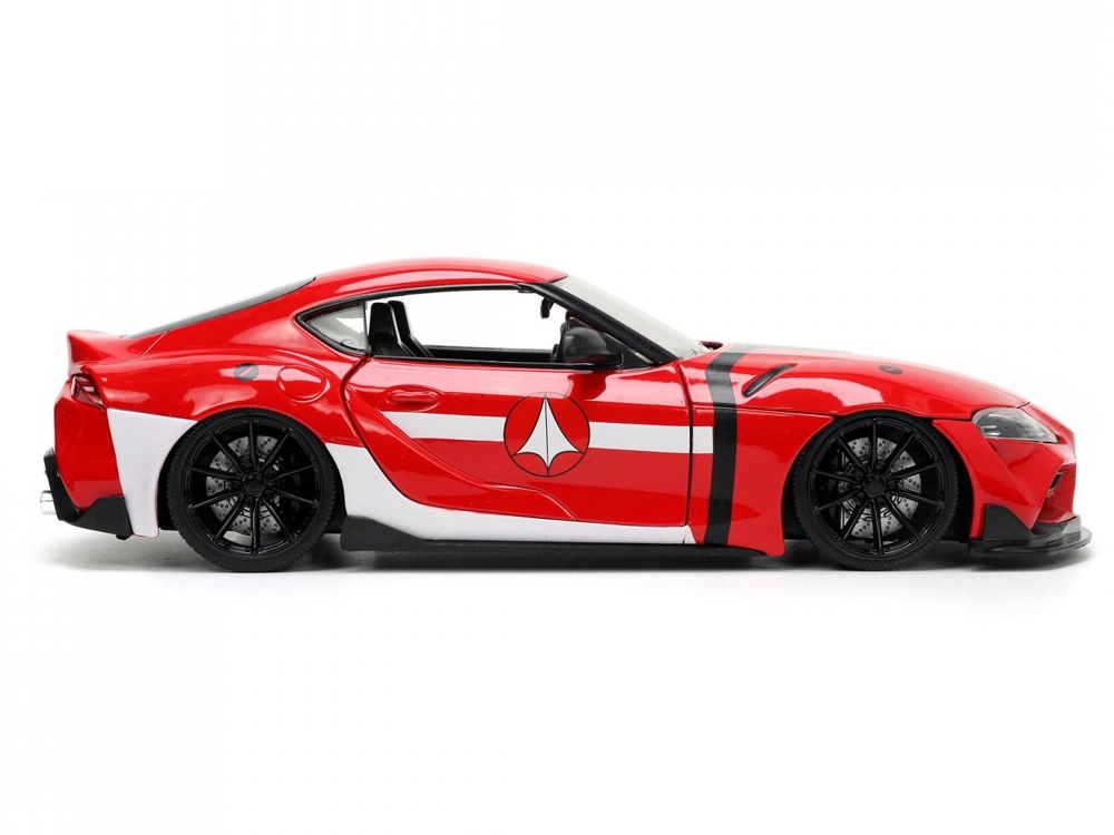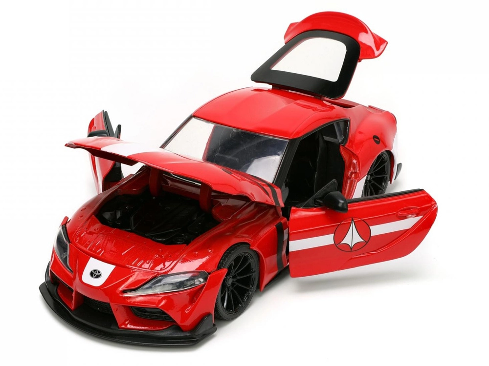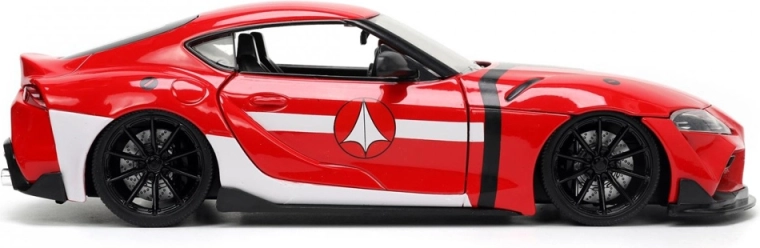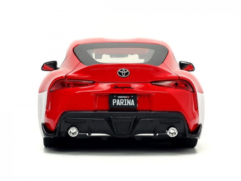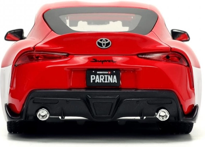 Prepracovaný model Toyota Supra 2020 v červenej farbe s bielymi pruhmi verne vystihuje športový charakter originálu a prepája automobilový dizajn s ikonickým univerzom ROBOTECH. Vďaka kovovej konštrukcii die-cast a citlivému spracovaniu detailov pôsobí ako skutočné vozidlo v miniatúre.