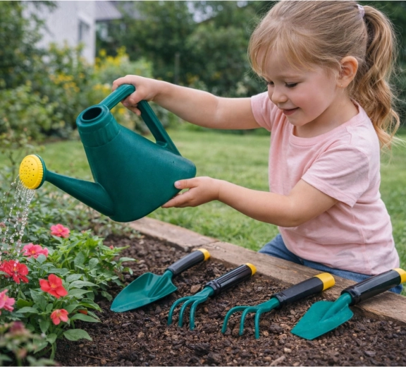 Praktická prenosná bednička udrží všetko na jednom mieste – deti si tak môžu vziať svoje náradie kamkoľvek do záhrady a po hre rýchlo upratať. Spoločné záhradníčenie posilňuje zodpovednosť a vzťah k prírode.