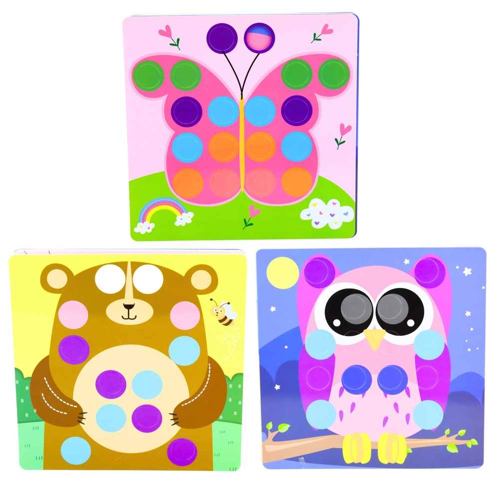 Deti vkladajú farebné gombíky do otvorov podľa predlôh a prirodzene si osvojujú rozlišovanie farieb aj jednoduché vzorovanie.