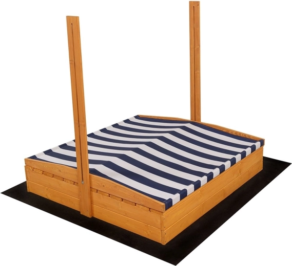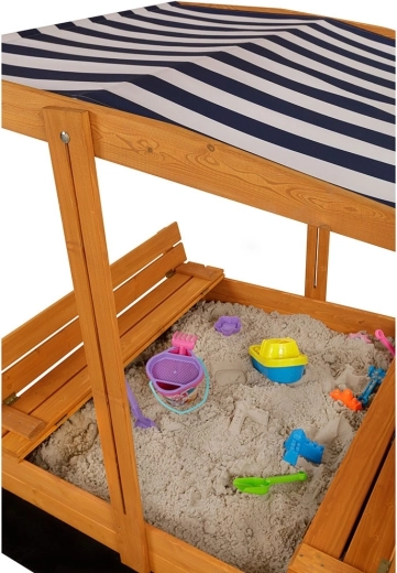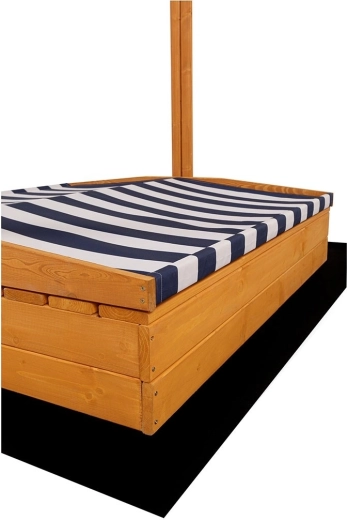 Modro‑bielo pruhovaná strieška je výškovo aj sklonovo nastaviteľná, chráni deti pred slnkom a po hre zakryje celý povrch pieskoviska proti dažďu a nečistotám.