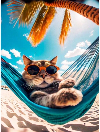Diamantové maľovanie je ideálnou voľbou na pokojné chvíle a kreatívny oddych. Pomocou aplikačného pera nanášate drobné kamienky na predtlačené a lepiace plátno podľa farebnej legendy. Výsledkom je trblietavý mozaikový obraz s motívom mačky v hojdacej sieti, ktorý možno po dokončení ľahko zarámovať (rám nie je súčasťou balenia).
