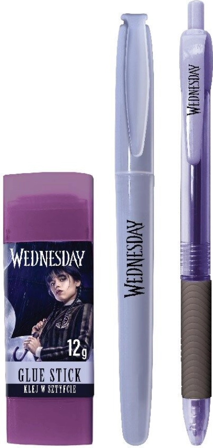 Štýlová písacia sada s motívom WEDNESDAY do školy aj kancelárie. Obsahuje pero s modrým atramentom (hrot 0,5 mm), tenký liner na presné písanie (čiara 0,4 mm) a zmizíkové lepidlo 8 g na rýchle a čisté lepenie.