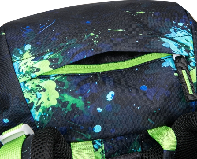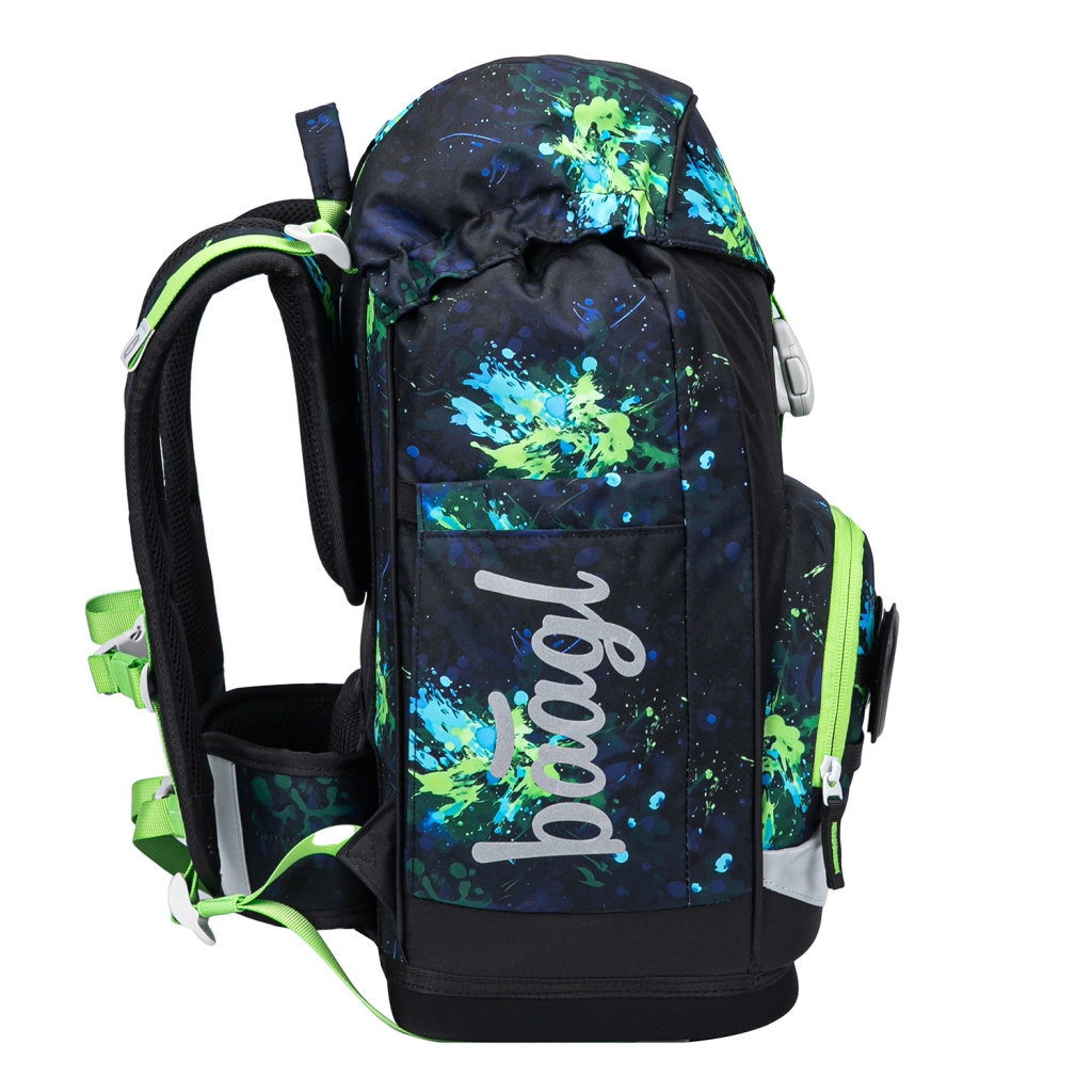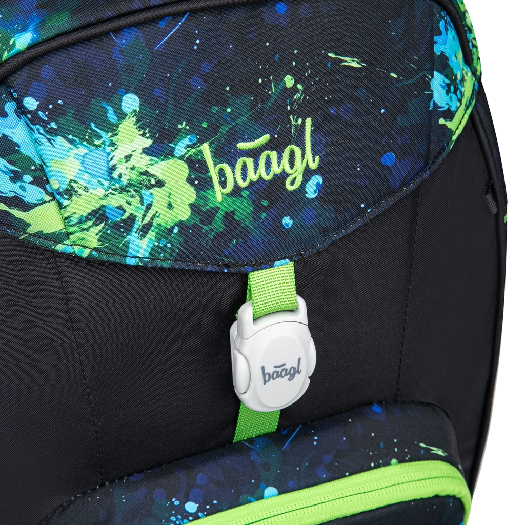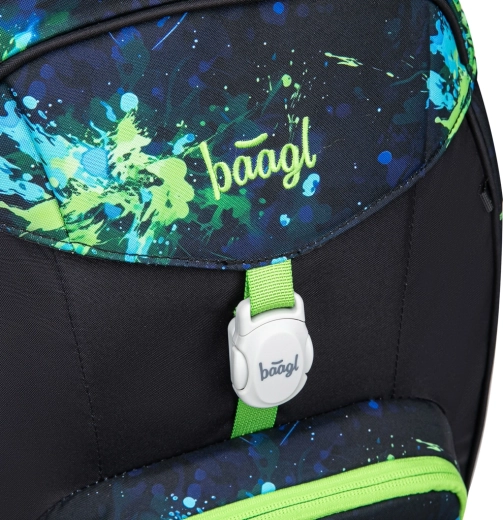 Praktická výbava zahŕňa magnetické zapínanie veka pre rýchle a jednoduché ovládanie, hlavnú komoru s organizérom a ochranné plastové dosky na zošity. Predné termo vrecko udrží desiatu dlhšie čerstvú a zabráni prenosu pachov. Batoh je z recyklovaného, vodoodolného materiálu, má reflexné prvky pre viditeľnosť a vymeniteľné odznaky (Baaglies) pre osobitý štýl.