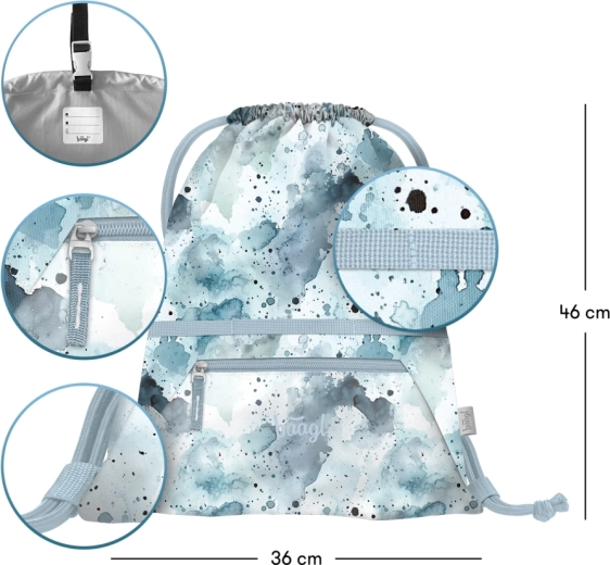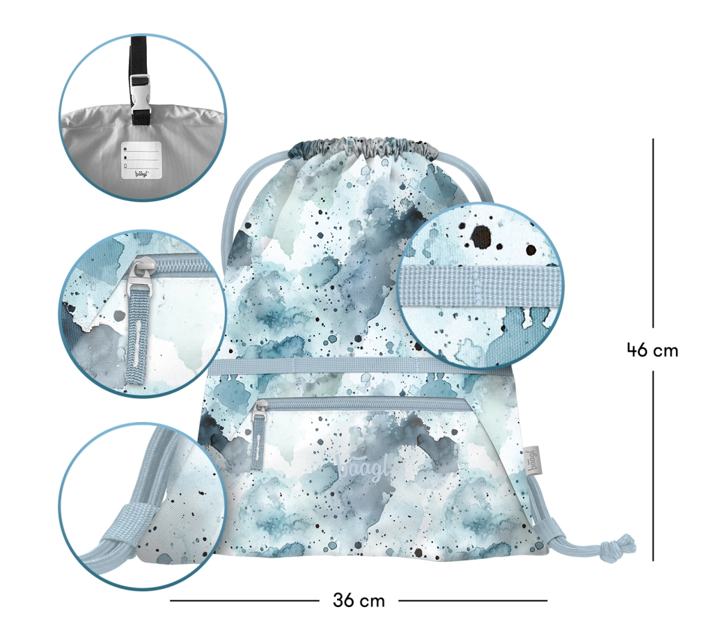 Vďaka pevnému a umývateľnému materiálu odolá každodennému používaniu. Silné sťahovacie šnúrky umožnia pohodlné nosenie na chrbte a praktické pútko s prackou zaistí jednoduché pripnutie k batohu alebo aktovke.