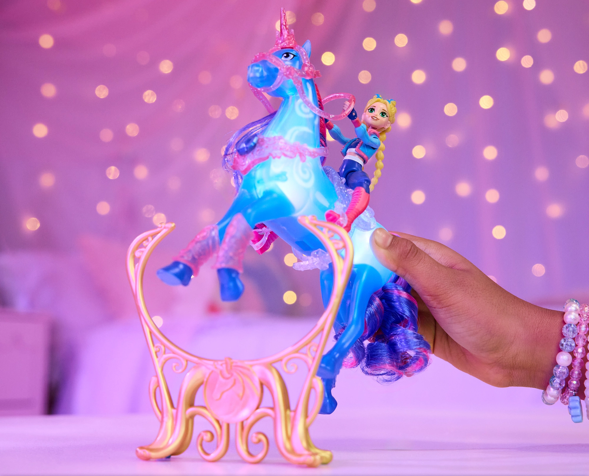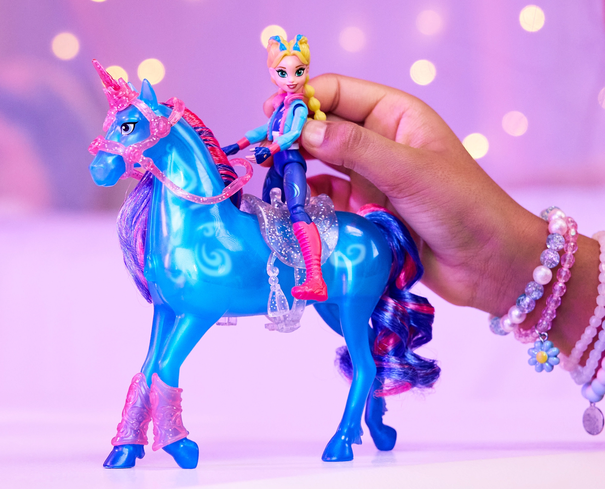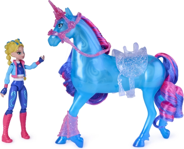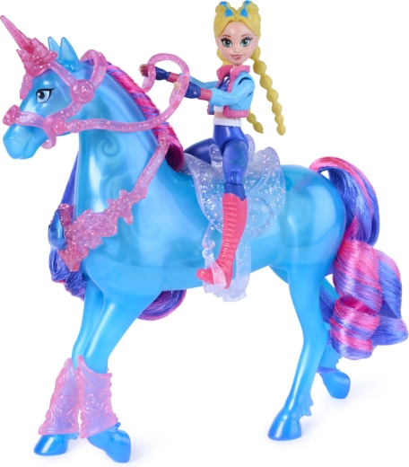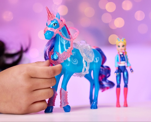 Bábika Isabel so 7 bodmi artikulácie a vybavený jednorožec umožnia prirodzené jazdenie, skoky aj efektné rearing na stojane.