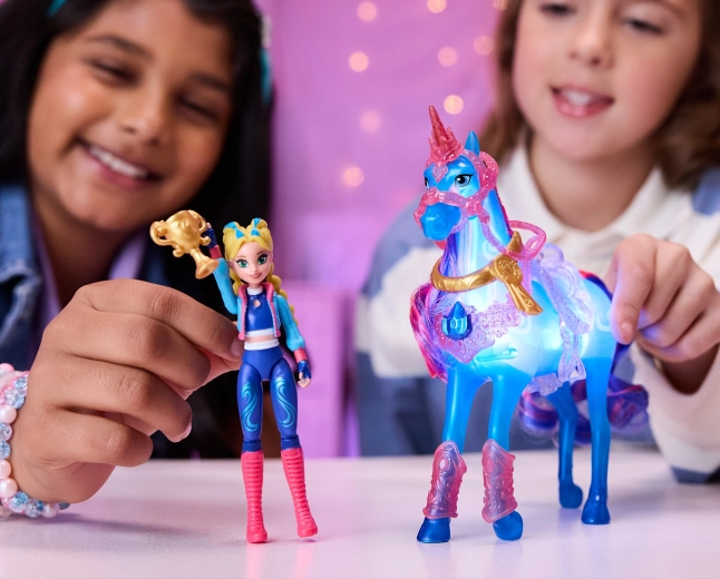 Vstúpte do sveta mágie s herným setom Unicorn Academy – Isabel a River. Bábika s výškou cca 11 cm má 7 kĺbových bodov na prirodzené pózovanie a priesvitný jednorožec River so svetelným efektom rozžiari každé dobrodružstvo. Aktivujte magické „vodné“ svetlo prejazdom tréningovou slučkou alebo stlačením drahokamu na nákrčníku. V balení nájdete aj tréningové doplnky, trofej a stužku pre ešte viac herných príbehov.