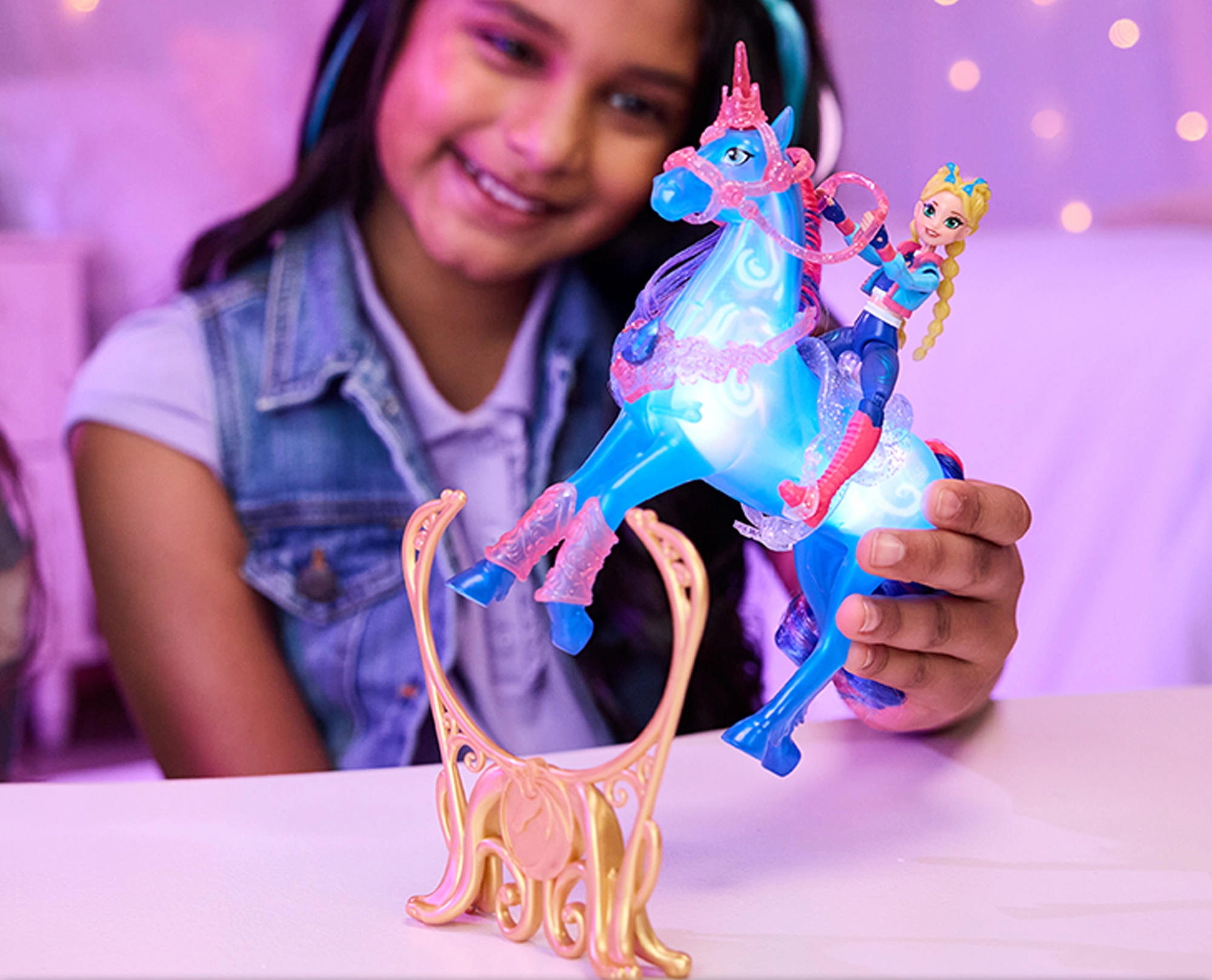 Set inšpirovaný obľúbeným seriálom Unicorn Academy prináša deťom možnosť znovu prežívať tréningové scény aj vytvárať vlastné magické príbehy. Jednorožec River z priesvitného plastu svieti v nádherných modrých tónoch a vďaka aktivácii tlačidlom na nákrčníku alebo jazdou cez prekážku dodá hre jedinečnú atmosféru.