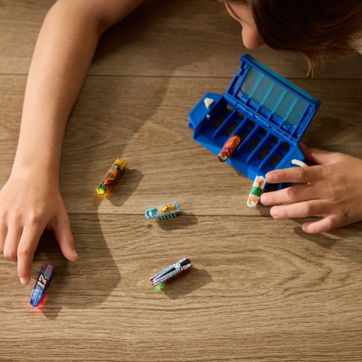 Múdry On‑The‑Go Launcher slúži ako puzdro aj štartovacia stanica v jednom. Uložíte doň až 6 Nano robotov a jediným tlačidlom otvoríte dvierka a vypustíte všetkých naraz – ideálne pre preteky a experimentovanie s trajektóriami. Sadu možno kombinovať s ďalšími setmi a prekážkami HEXBOTS Nano a budovať vlastné labyrinty a pretekárske dráhy.