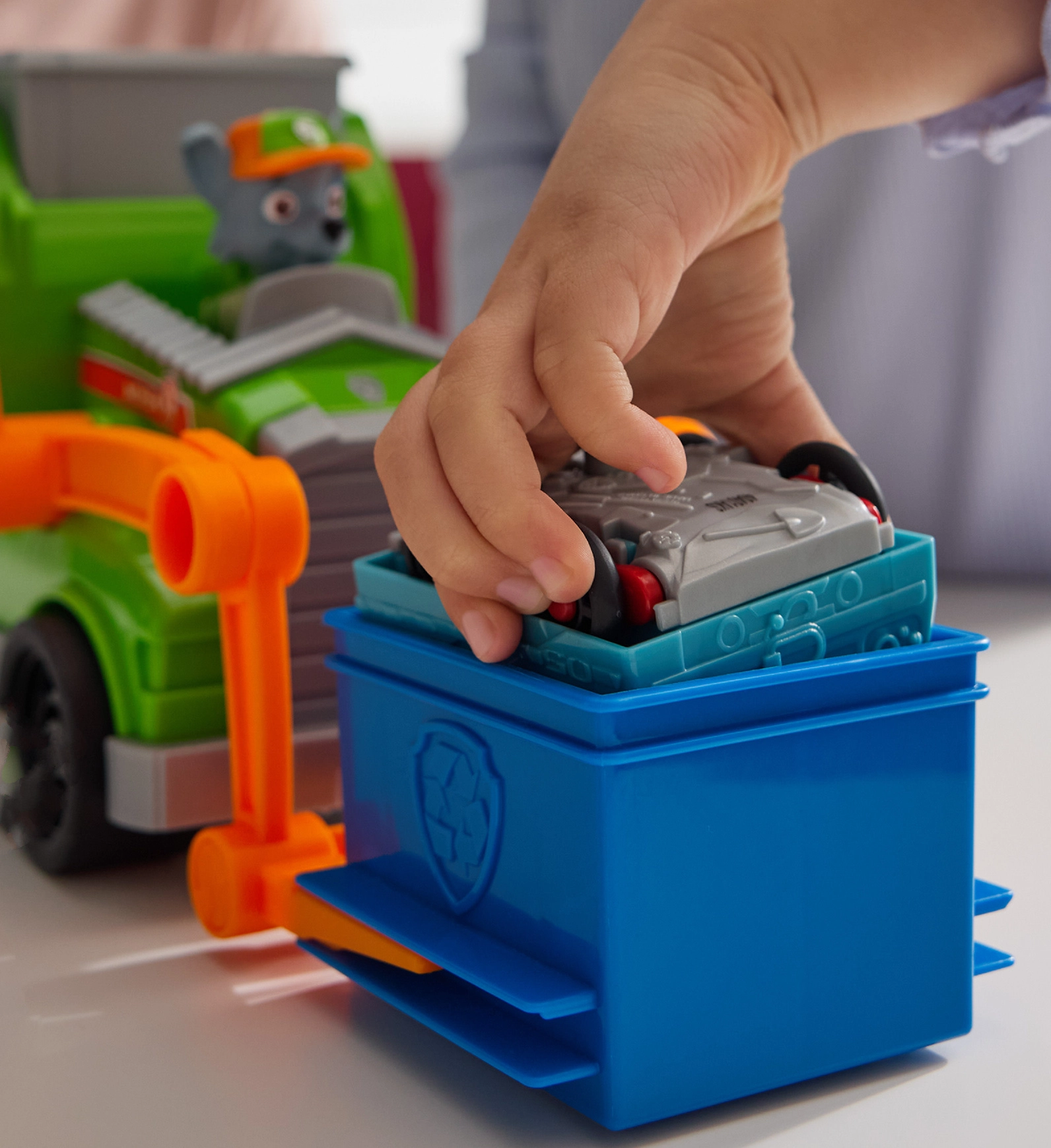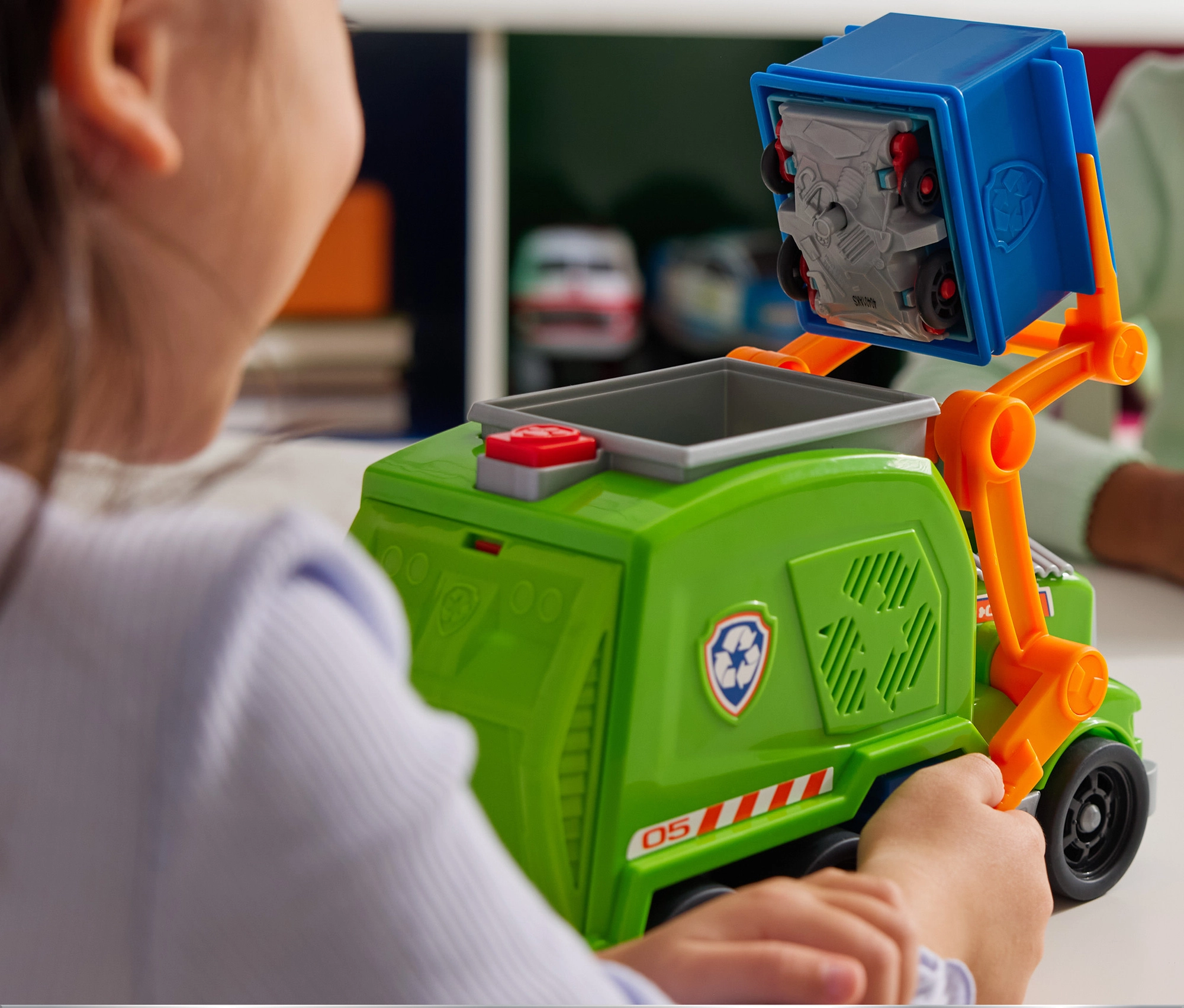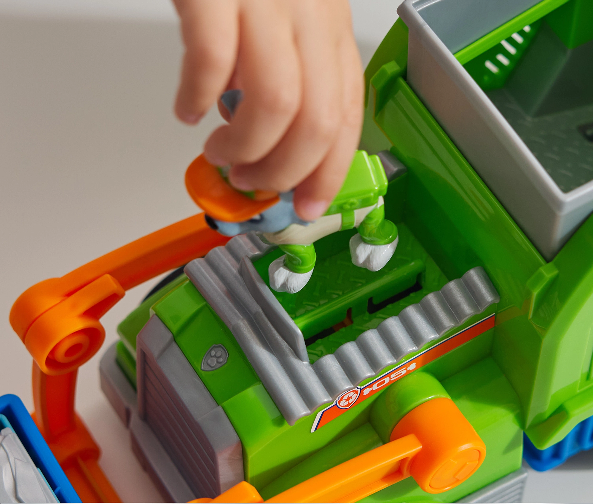 Obľúbený hrdina Rocky je pripravený učiť deti recyklácii a šikovne pretvárať odpad na užitočné veci. Recyklačné auto Crush ’N’ Roll ponúka realistické prvky – kôš na odpad, manipulačný vozík a páku, ktorá spúšťa drvenie a premenu pomačkaného vozidla na mini autíčko. Deti môžu Rockyho usadiť do kabíny a podniknúť nové misie ako v seriáli PAW PATROL.