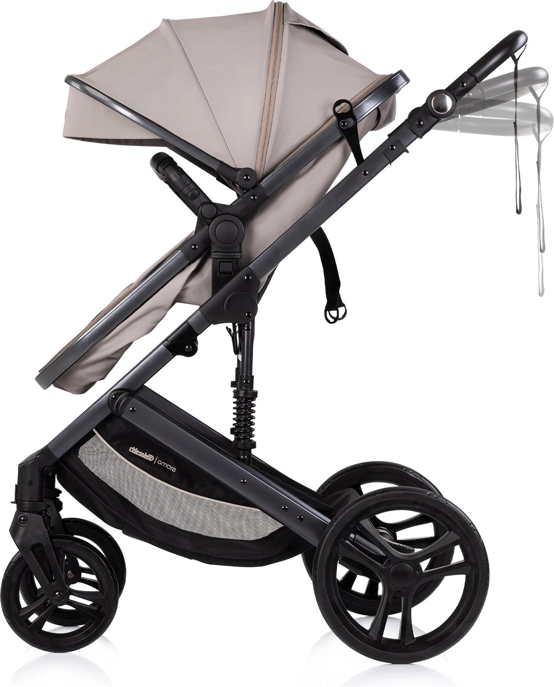 5-bodový pás s polstrovaním, odnímateľné madlo, nastaviteľná opierka v 3 polohách a veľká strieška s odopínacou slnečnou clonou pre komfort v každom počasí.