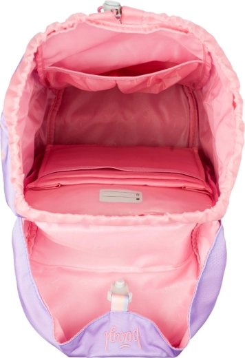 Jednokomorové vnútorné usporiadanie s vreckom a gumičkou na dosky uľahčuje prehľadnú organizáciu školských potrieb. Batoh je z recyklovaného, vodeodolného materiálu a jeho vzhľad možno meniť vďaka odnímateľným odznakom. Súčasťou setu je jednoposchodový peračník s dvoma chlopňami a kvalitným zipsom YKK (bez náplne), vrecko s vreckom na zips z pevného umývateľného materiálu, detská zástera s dvoma spodnými vreckami a praktická peňaženka na krk.