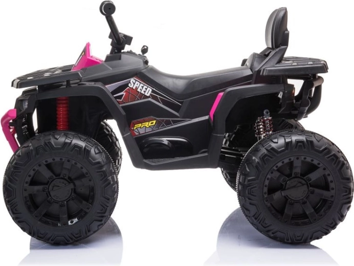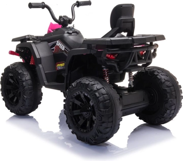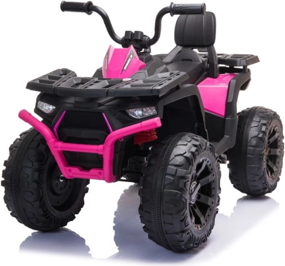 Ružovo‑čierny dizajn s ochranným nárazníkom a realistickými prvkami dodáva štvorkolke atraktívny off‑road štýl.