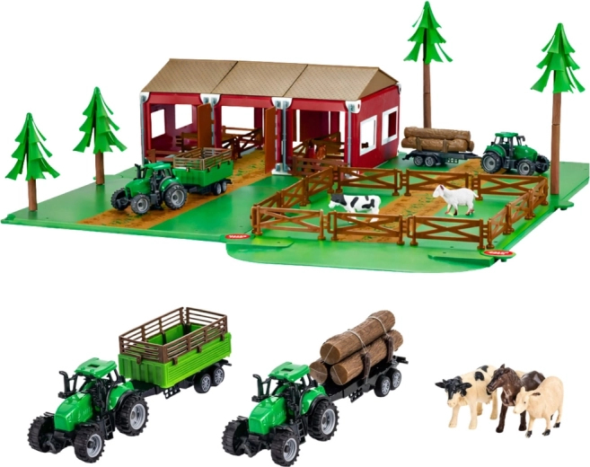 Dva traktory a dva prívesné vozíky umožnia prevážať drevo aj ďalší náklad a realisticky napodobňovať práce na farme. Detailné spracovanie budov, plotov a kabín traktorov z kvalitného plastu zaisťuje odolnosť a pútavý vzhľad.
