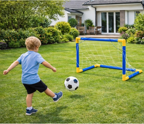 Ľahká a stabilná detská futbalová bránka s kompletným príslušenstvom – lopta, pumpička a sieť – na zábavný tréning doma aj vonku. Jednoduchá montáž, odolné plastové trubky a kompaktné rozmery podporujú pohyb, koordináciu a presnosť streľby.