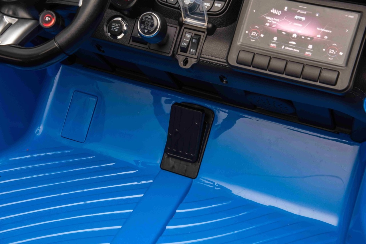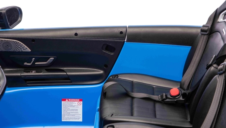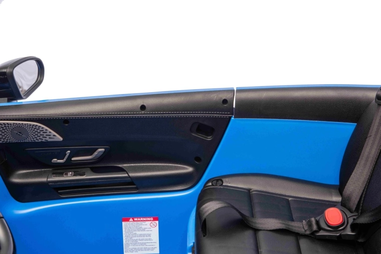 Interiér poteší dvoma sedadlami z eko kože s bezpečnostnými pásmi, realistickou palubnou doskou a multimediálnym panelom s MP3, USB, Bluetooth, AUX a FM rádiom. Vďaka otváracím dverám, LED svetlám vpredu aj vzadu a funkcii soft start je jazda bezpečná a maximálne realistická. Rodičia majú všetko pod kontrolou vďaka ovládaču 2,4 GHz s tromi rýchlosťami a núdzovým STOP.