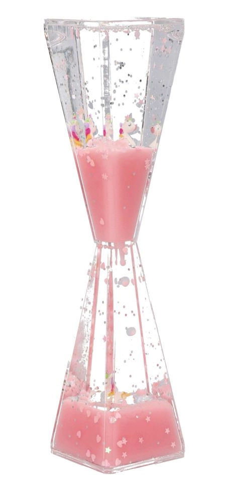 Táto priehľadná tekutá klepsydra v tvare presýpacích hodín s ružovou náplňou a trblietkami ponúka jemný, plynulý tok kvapiek z hornej do spodnej komory. Vytvára relaxačnú podívanú, ktorá pomáha upokojiť myseľ pri práci, učení aj oddychu.
