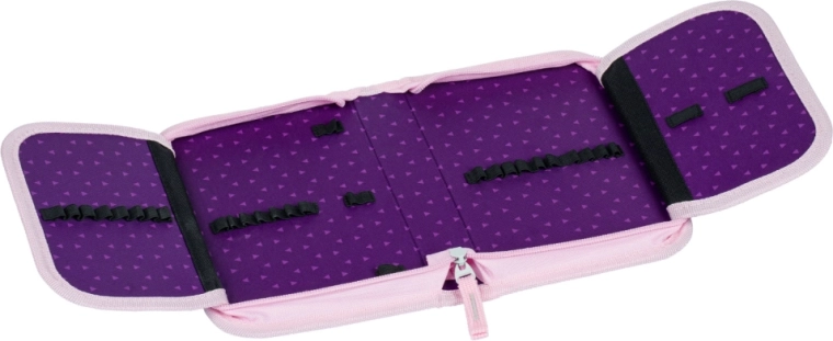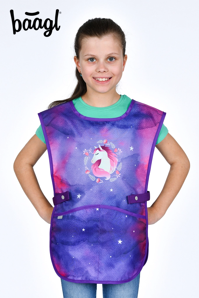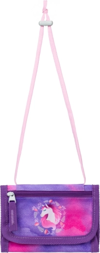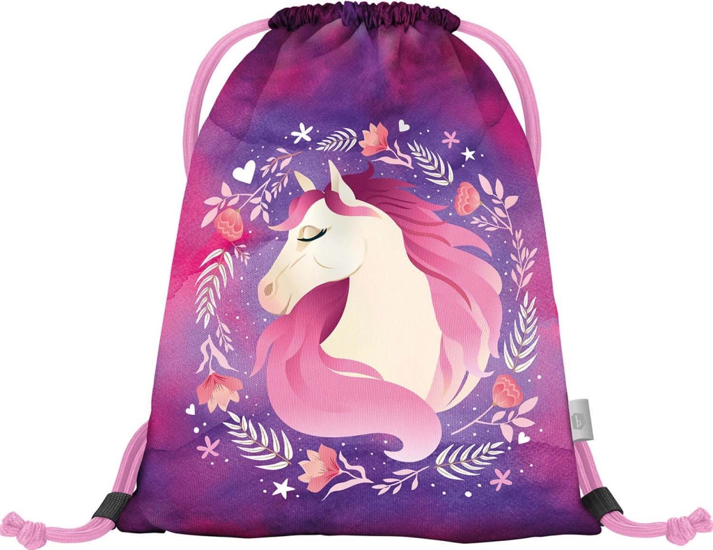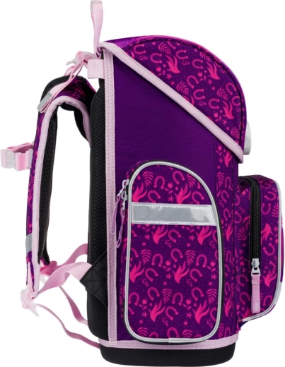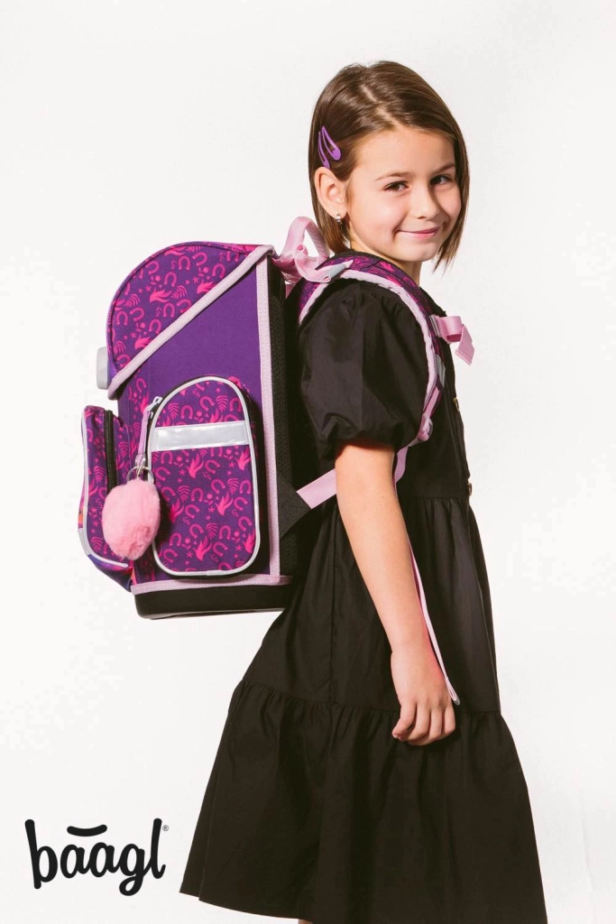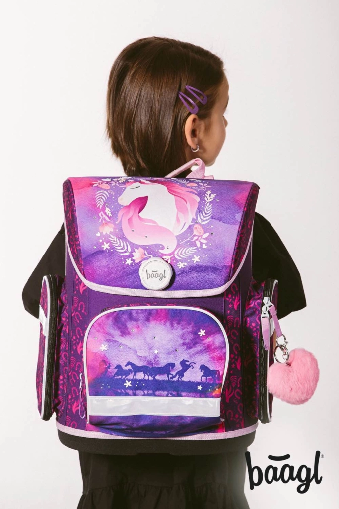Kompletná školská výbava pre malých školákov s motívom Kôň v kúzelných fialovo-ružových farbách. Set obsahuje ergonomickú aktovku s nastaviteľným chrbtovým systémom, ľahké vrecko na obuv, dvojchlopňový peračník, umývateľnú zásteru a peňaženku na krk. Bezpečnosť zabezpečujú reflexné prvky, pohodlie priedušný chrbát a jednoduché ovládanie magnetického zapínania Fidlock.