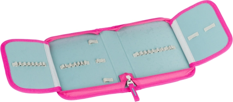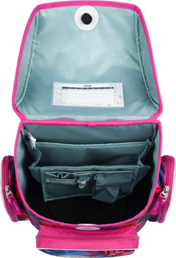 Vo vnútri aktovky nájdete prehľadný organizér s priehľadným vreckom na rozvrh, izolované predné vrecko na desiatu a dve bočné vrecká ideálne na fľašu s pitím. Súčasťou setu je jednoposchodový peračník bez náplne so zipsom YKK, ľahký vak na obuv či potreby do krúžkov, umývateľná detská zástera s dvoma vreckami a peňaženka na krk s menovkou a bezpečnostnou poistkou na šnúrke.