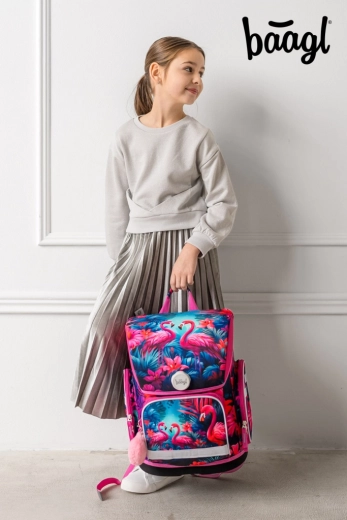 Štýlový školský set s motívom plameniakov pre prvý stupeň ZŠ zahŕňa ergonomickú aktovku, peračník, vak, zásteru a peňaženku na krk. Aktovka má posuvný chrbtový systém, ergonomicky tvarovaný chrbát, magnetické zapínanie Fidlock, reflexné prvky a ľahkú, vodeodolnú konštrukciu pre bezpečné a pohodlné nosenie. Praktické vrecká a premyslená organizácia zaistia prehľad o všetkých školských potrebách.