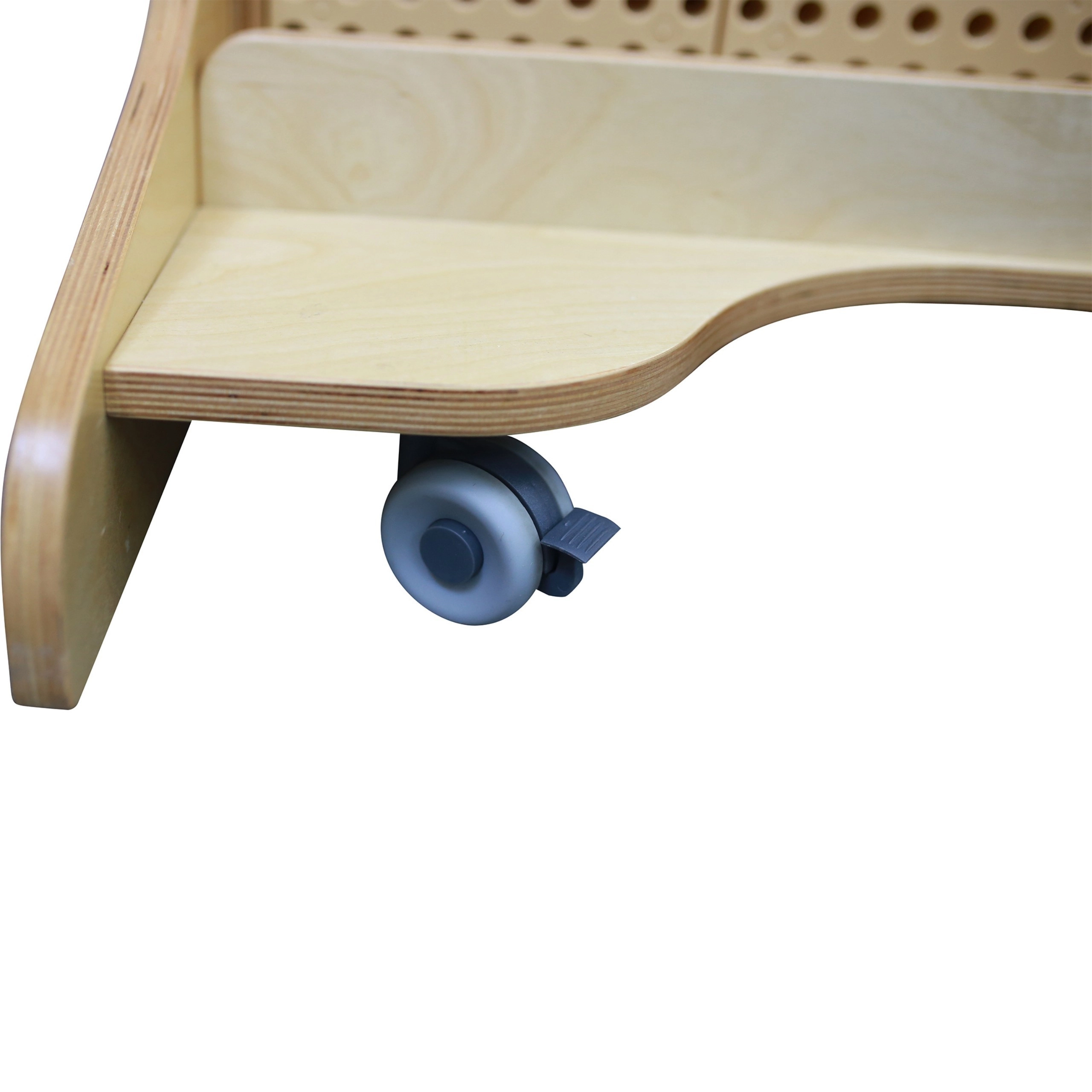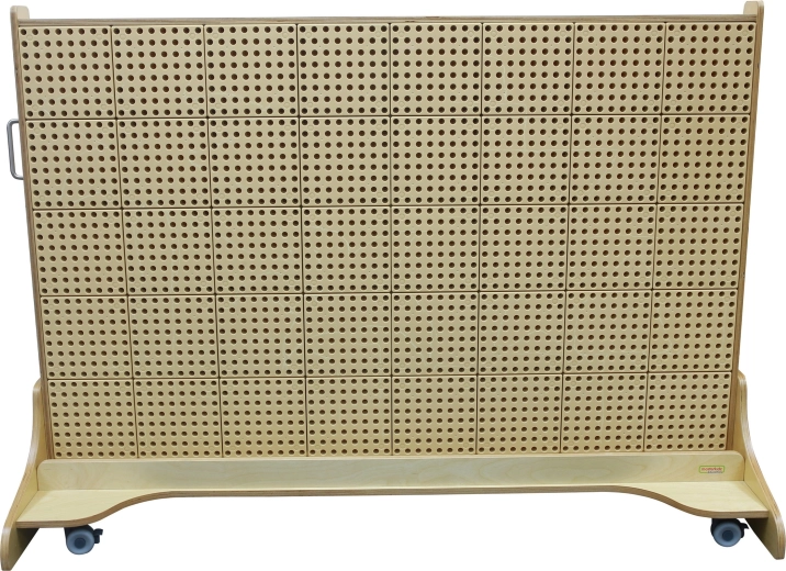 Veľká perforovaná doska s robustnou konštrukciou a kolieskami s brzdou umožňuje ľahký presun aj stabilnú prácu pri stavbe projektov.