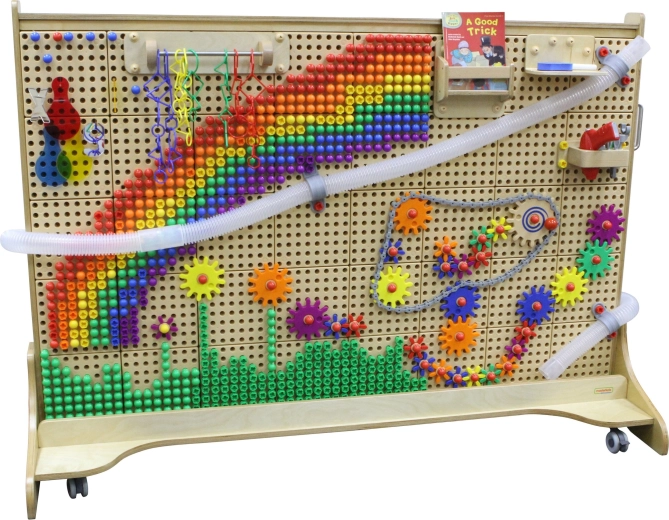 Tento komplexný STEM set ponúka robustnú perforovanú dosku na kolieskach, ktorá slúži ako stavebná stanica pre ozubené kolieska, skrutky, kolíky, dráhy pre guličky aj kreatívne mozaiky. Vďaka bohatej sade príslušenstva deti ľahko pochopia princípy príčiny a následku, mechaniky a fyziky.