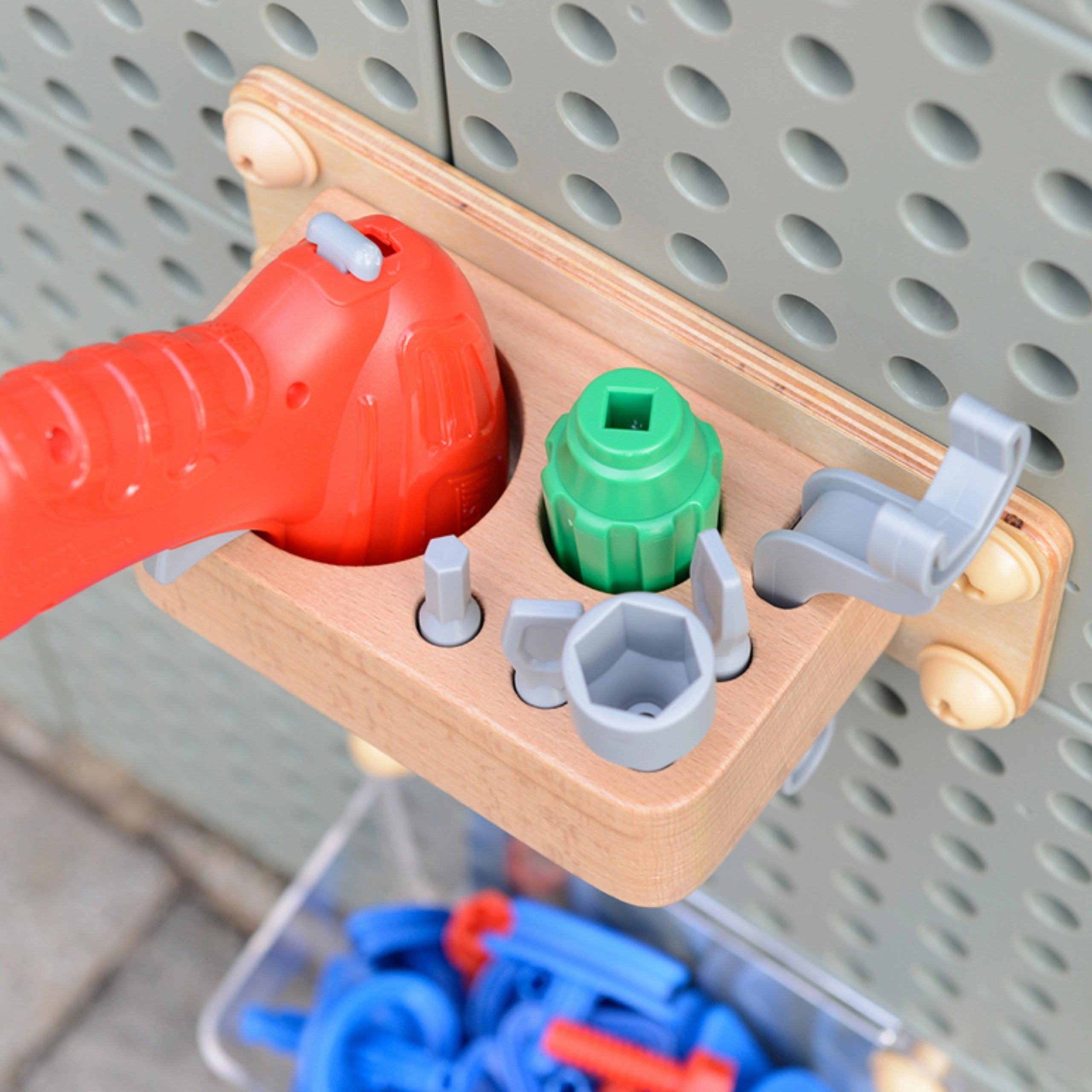 Súčasťou sú detská vŕtačka, skrutkovač a kľúč na skutočné skrutkovanie, priehľadné tácové organizéry, pestré kolíky a skrutky, ozubené kolieska s reťazou aj modulárna trať pre guličky. Modulárny systém dielov nabáda k samostatnému experimentovaniu, rozvíja koordináciu ruka–oko, presnosť a radosť z tvorenia.