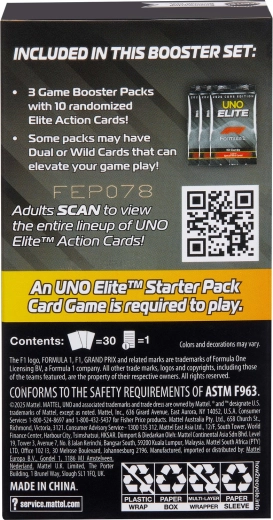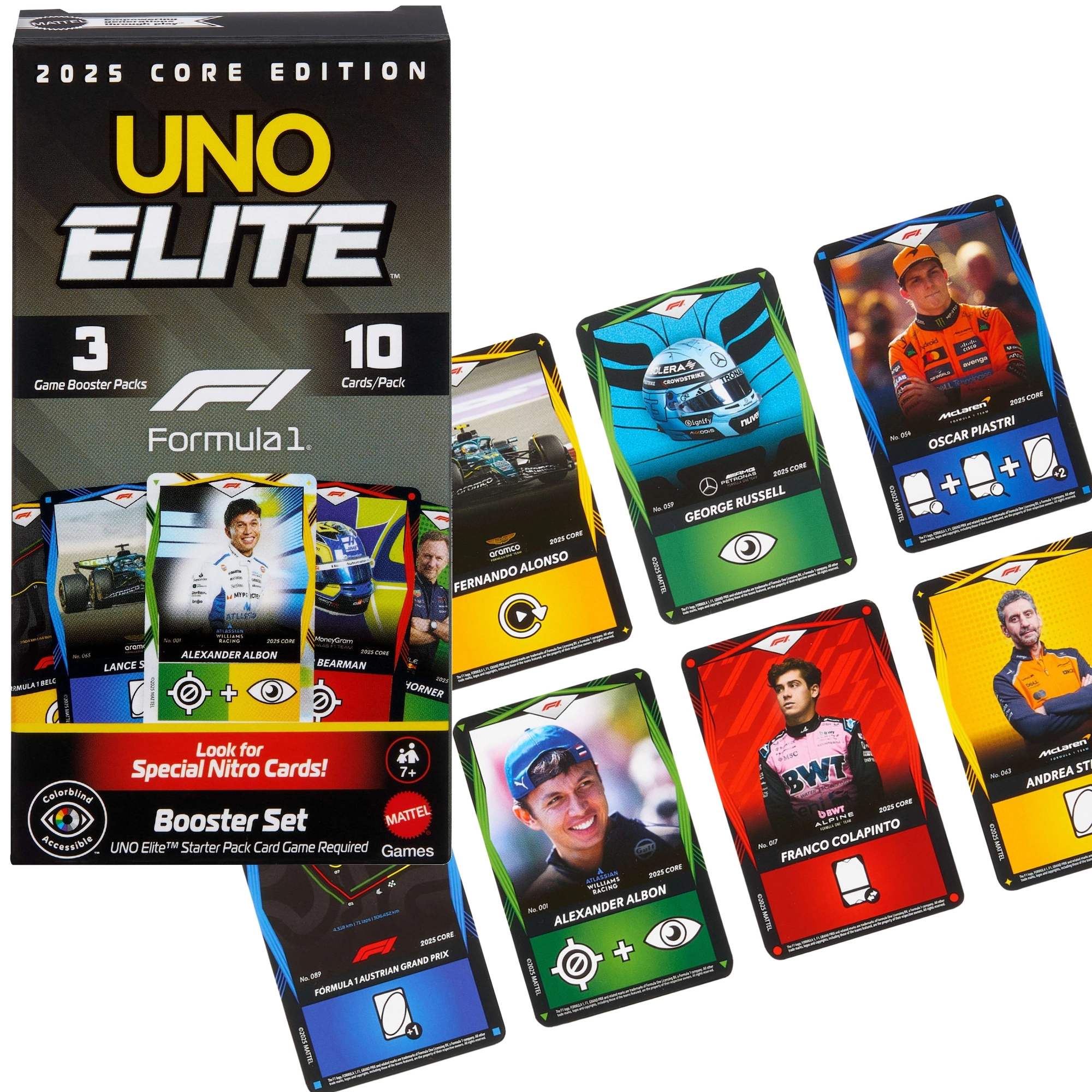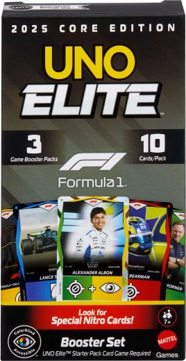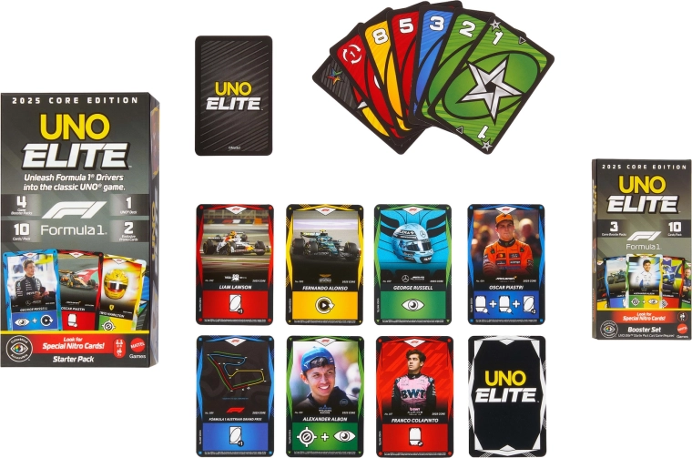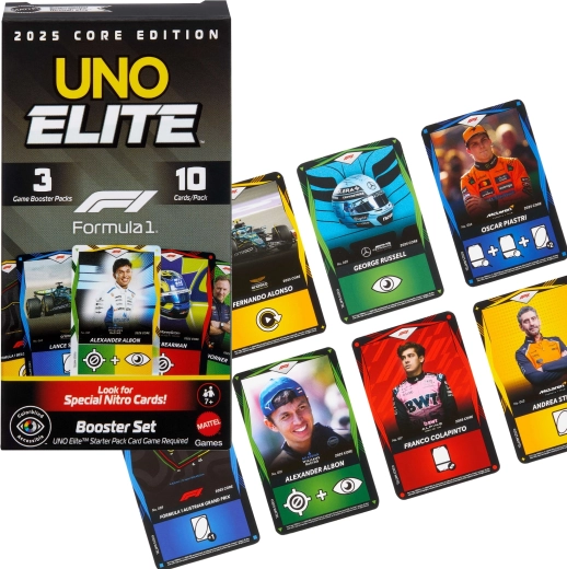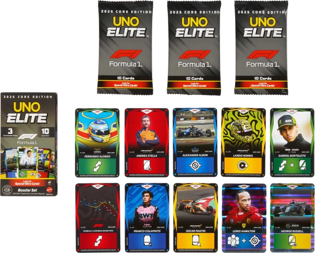 Vstúpte do rýchleho tempa pretekov s rozšírením UNO Elite Formula 1 2025. Každý Booster Pack prináša náhodne vybrané karty s motívmi jazdcov F1, monopostov, heliem a okruhov. Špeciálne karty Elite aktivujú svoje schopnosti pri vyložení karty s ikonou Elite rovnakej farby, vďaka čomu získate nové stratégie a napínavé momenty v každej partii.