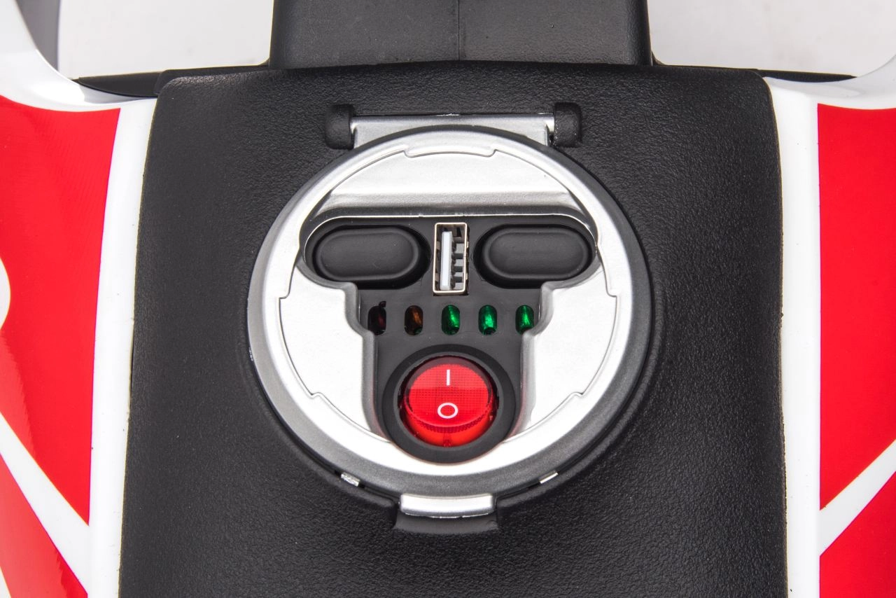 Motorka je vybavená moderným audio panelom s MP3, USB, Bluetooth a vstavanými melódiami – obľúbená hudba bude na ceste vždy po ruke. Výkonný pohon 2x35 W napájaný batériou 12 V 7 Ah ponúkne dostatok sily aj na jazdu po záhrade. LED predné svetlá zvyšujú viditeľnosť a dodávajú atraktívny vzhľad.