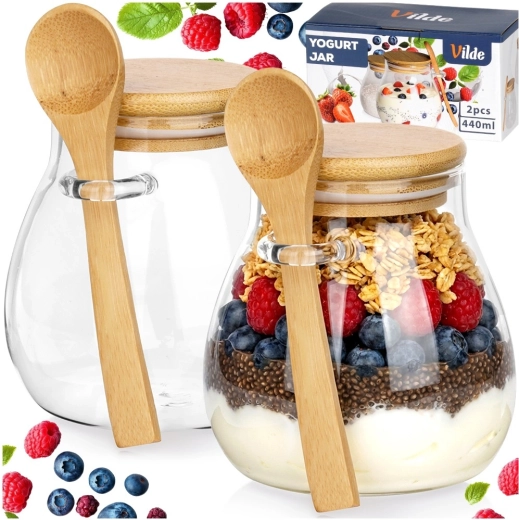 Dva sklenené poháre 440 ml s bambusovými viečkami a lyžičkami – ideálne na servírovanie aj skladovanie dezertov a desiat doma i na cestách.
