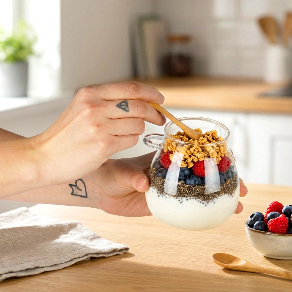 Objavte štýlové a praktické poháre, ktoré zvýraznia vaše domáce jogurty, chia pudingy aj vrstvené dezerty. Číre sklo krásne prezentuje obsah, zatiaľ čo bambusové viečko s tesnením chráni pred osychaním a pohlcovaním pachov. Integrovaný držiak na boku udrží lyžičku vždy pripravenú na servírovanie.