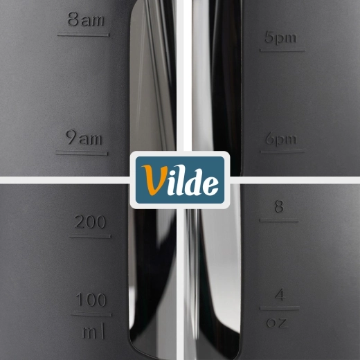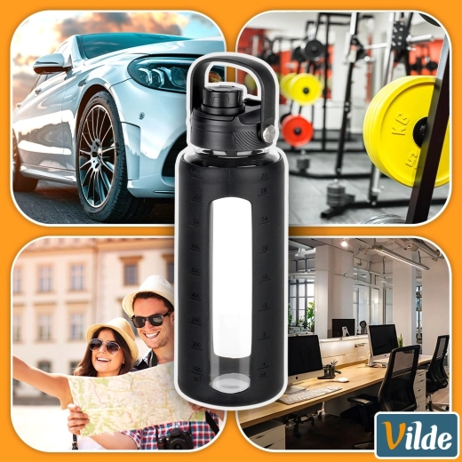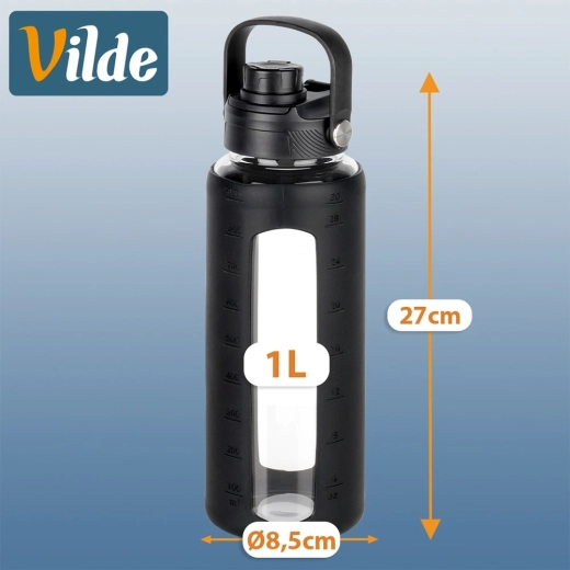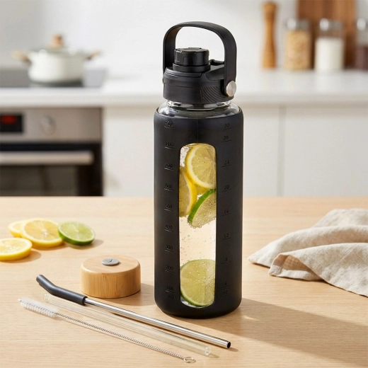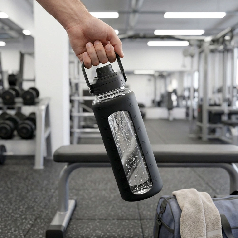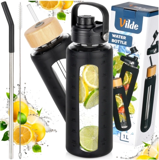 Udržiavajte si pitný režim štýlovo a prehľadne. Táto sklenená fľaša s objemom 1 liter je vyrobená z borosilikátového skla odolného proti teplotným šokom (cca −20 °C až 120 °C). Silikónový ochranný obal zlepšuje úchop, chráni sklo a vďaka okienku umožňuje rýchlu kontrolu hladiny aj pohodlné čítanie mierky v ml/oz a časových značiek.