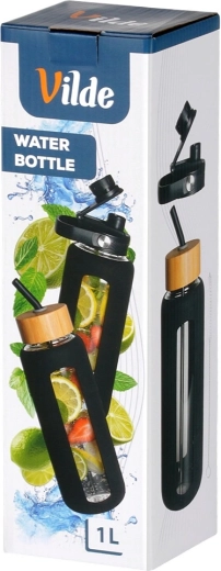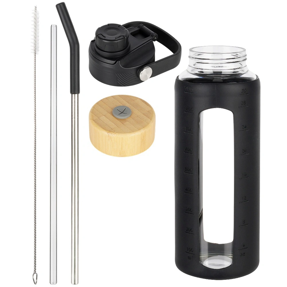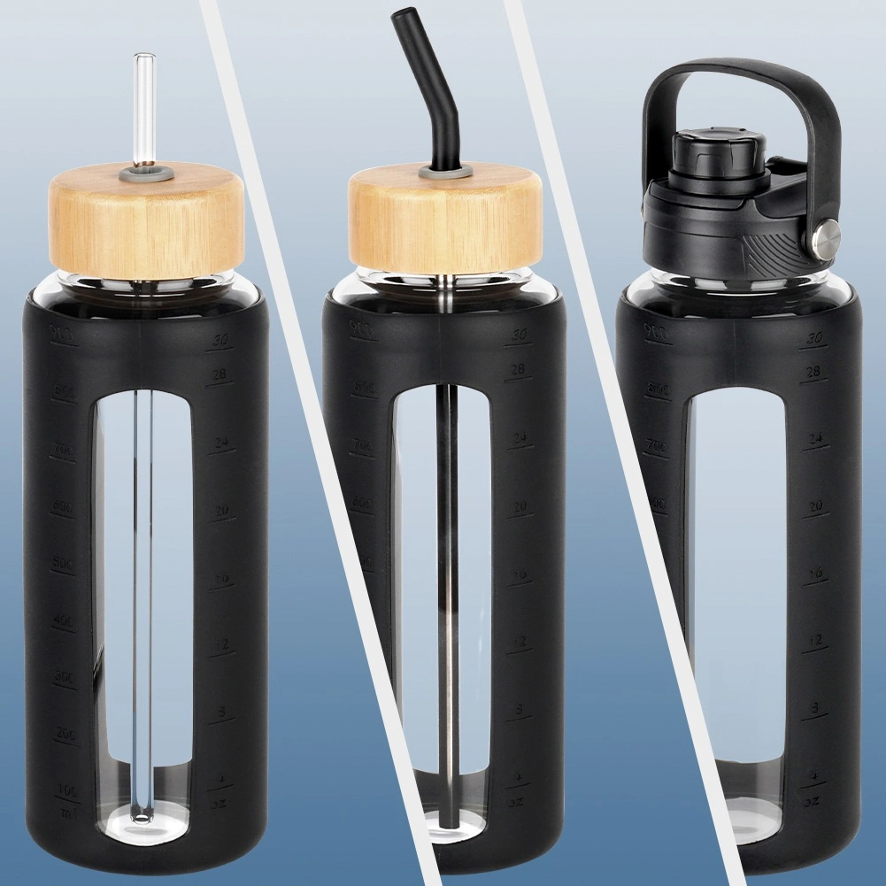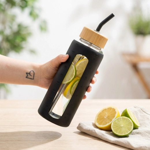 Súčasťou je dvojité uzatváranie: športové viečko s náustkom a madlom na pitie na cestách aj do fitka a bambusové viečko s otvorom na slamku. V balení nájdete tiež nerezovú slamku so silikónovou koncovkou, sklenenú slamku a čistiaci kefku. Bez silikónového obalu možno fľašu umývať v umývačke. Skvelé na vodu, citronádu, ľadový čaj aj ochutené nápoje s ovocím.