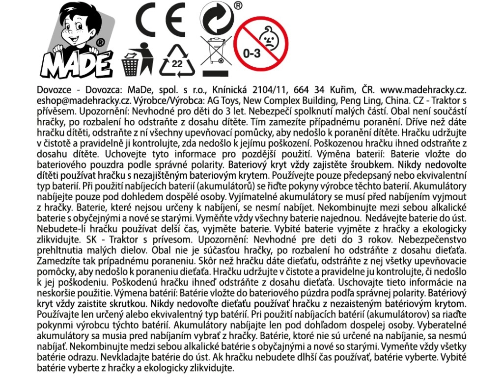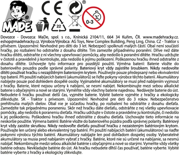 Traktor je pripravený na použitie ihneď po vybalení, pretože 3 batérie AG13 sú súčasťou balenia. Vďaka kompaktným rozmerom sa ľahko zmestí do detskej ruky a je vhodný na hranie doma aj na cestách.