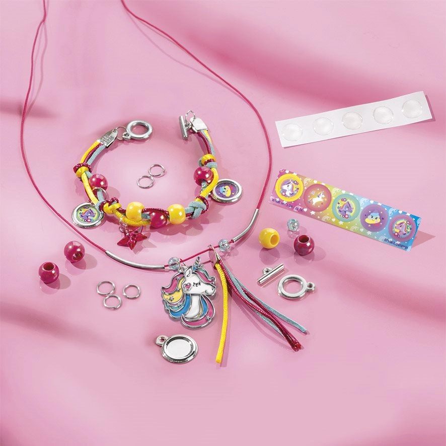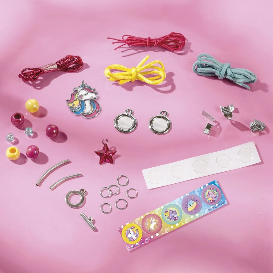 Táto čarovná kreatívna sada prináša dvojnásobnú zábavu: výrobu šperkov a zdobenie kabelky. Deti si ľahko vytvoria náramok a náhrdelník s korálikmi a príveskom jednorožca a následne vyzdobia látkovú kabelku pomocou 3D gombíkov, samolepiek na suchý zips a trblietavých kamienkov v tvare srdca.