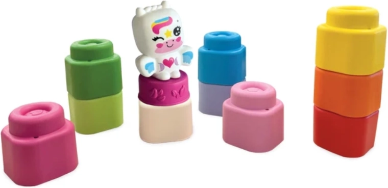 Objavte prvú stavebnicu pre najmenších: mäkké a bezpečné kocky SOFT CLEMMY v sade 10 ks doplnené o roztomilú figúrku jednorožca. Kocky v výrazných veselých farbách sa ľahko uchopujú, podporujú zmyslový a motorický rozvoj, rozvíjajú jemnú motoriku, koordináciu oko–ruka aj kreativitu. Vyrobené z mäkkej, netoxickej gumy, ľahko umývateľné a príjemne voňajúce.