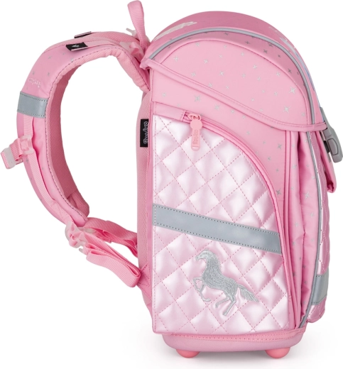 Ľahký a pohodlný školský set pre malé školáčky s motívom koňa. Obsahuje priestrannú aktovku s ergonomickým chrbtovým systémom, vrecko na prezuvky a jednokomorový peračník. Vďaka odľahčenej konštrukcii váži aktovka len 970 g, má reflexné prvky, magnetické zapínanie a praktické členenie na prehľadné uloženie školských potrieb.