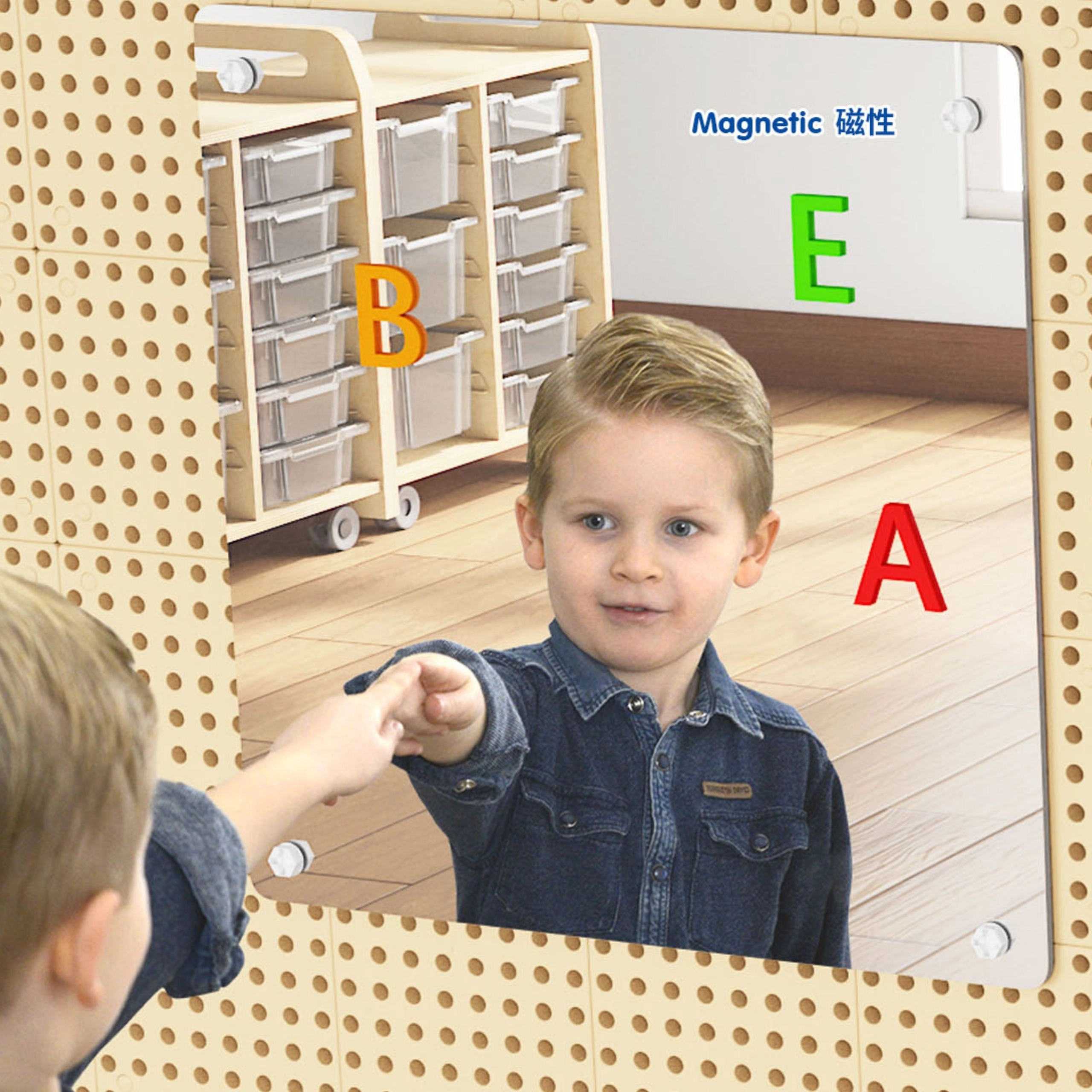 Veľké magnetické zrkadlo MASTERKIDZ premení každú učebňu či detský kútik na interaktívne centrum učenia. Unikátny magnetický povrch umožňuje pripevnenie písmen, čísel a didaktických prvkov, zatiaľ čo deti skúmajú mimiku, emócie a koordináciu pohybov. Rozmer 60 × 60 cm poskytuje dostatok priestoru pre skupinové aj individuálne aktivity.